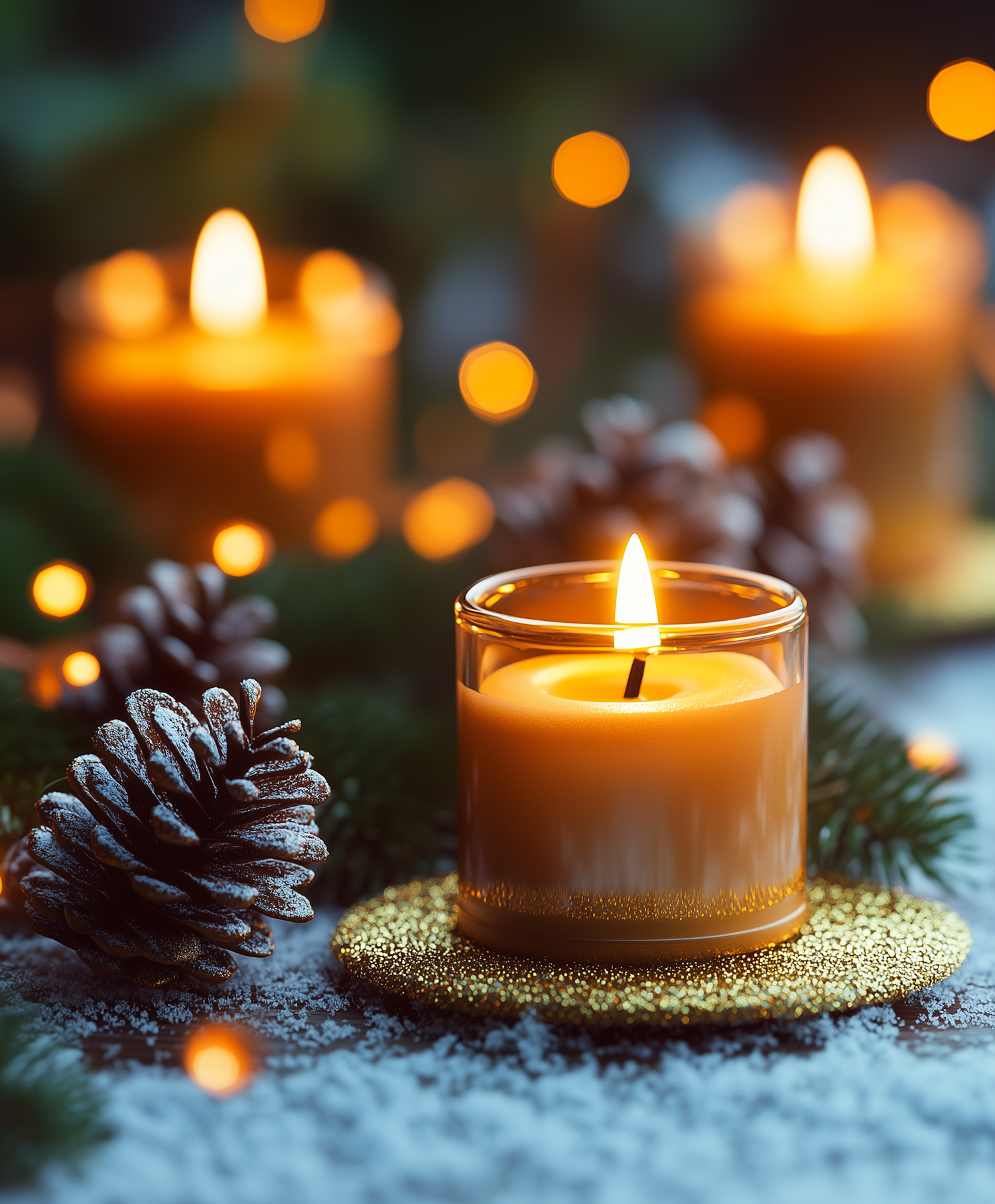 Cozy winter scene with glowing candles, snow-dusted pinecones, and festive bokeh lights, creating a warm holiday atmosphere.