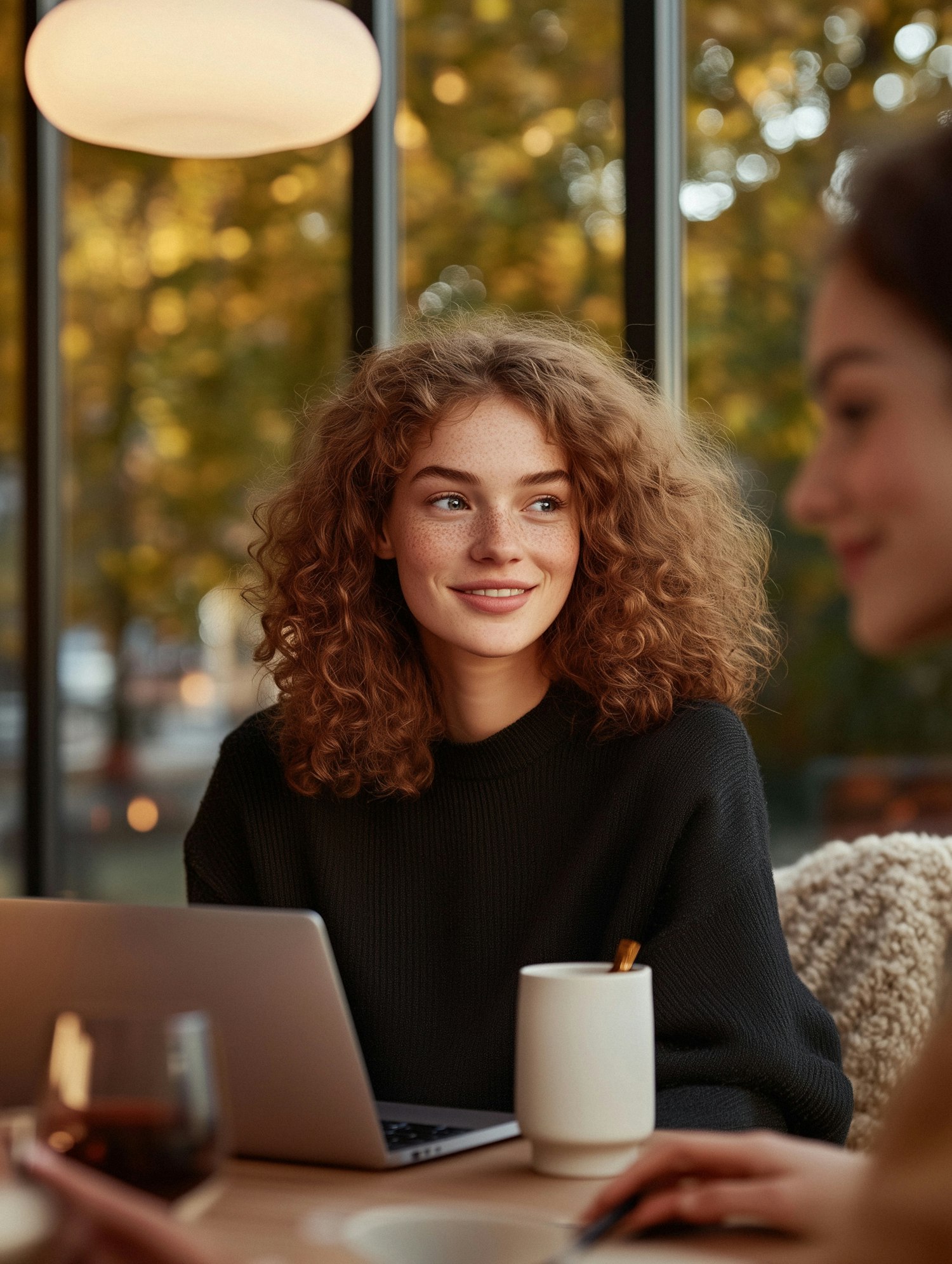 Young woman with curly red hair and freckles in a cozy cafe, smiling with a laptop and mug, surrounded by autumn foliage.