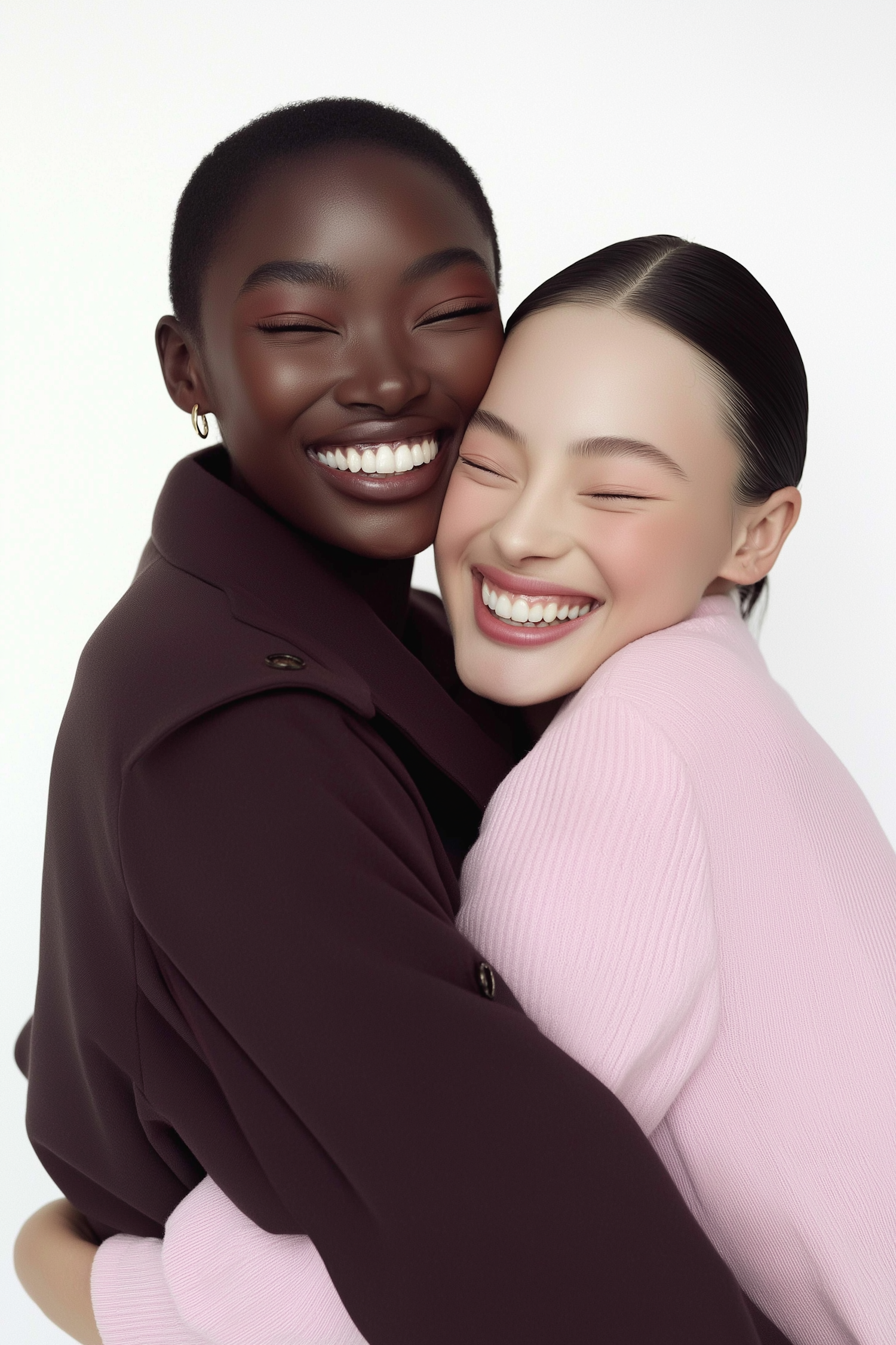 Two women joyfully embrace, showcasing friendship and diversity with radiant smiles against a plain white background.