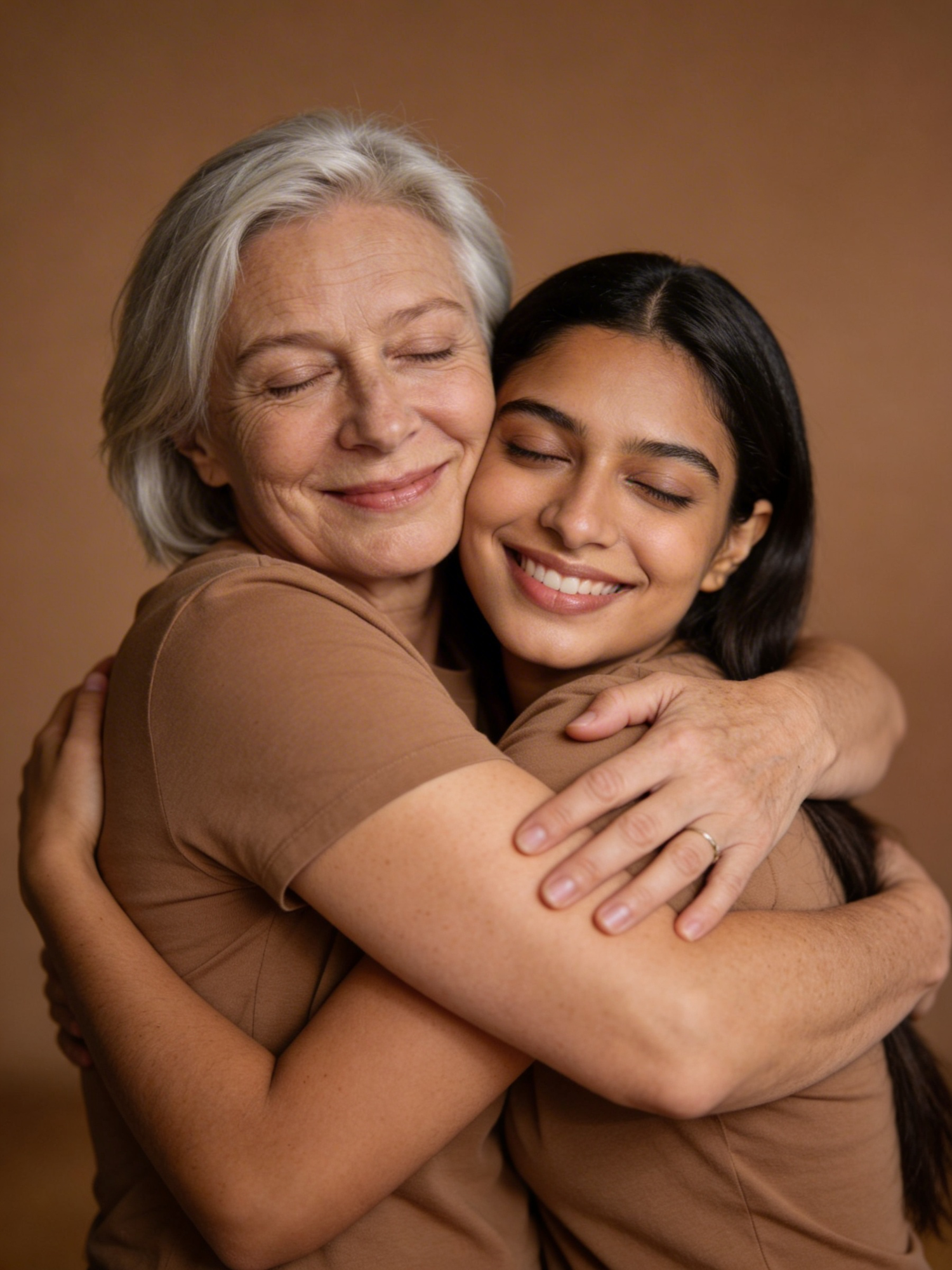 A heartwarming embrace between two individuals, showcasing affection and connection against a warm brown background.