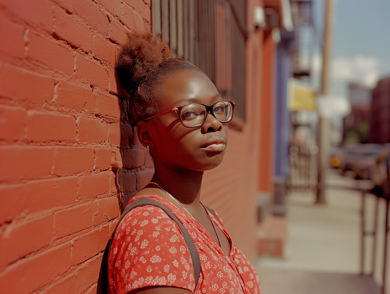 Person with blurred face in red floral dress against a red brick wall, urban background, natural afro puff hairstyle, sunglasses.