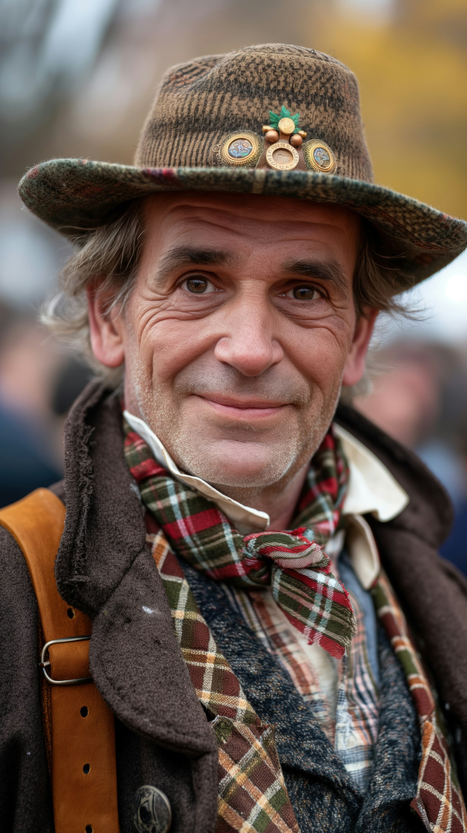 Middle-aged man in a brown hat with decorative pins, wearing a plaid scarf and coat, smiling warmly in an outdoor setting.