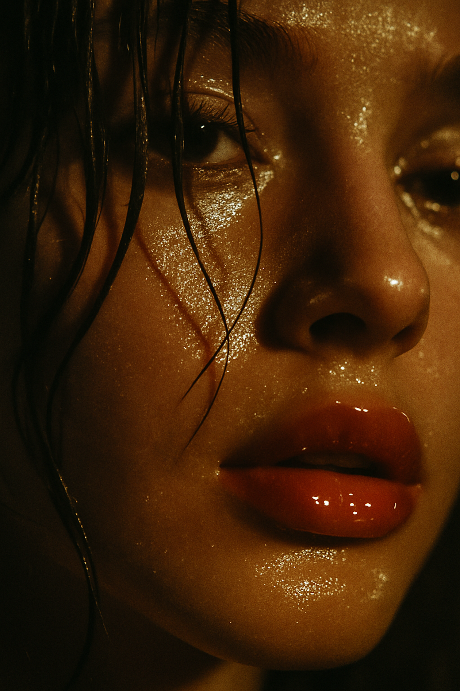 Close-up with warm tones focused on smooth shiny skin and glossed lips, emphasizing rich textures and reflections.