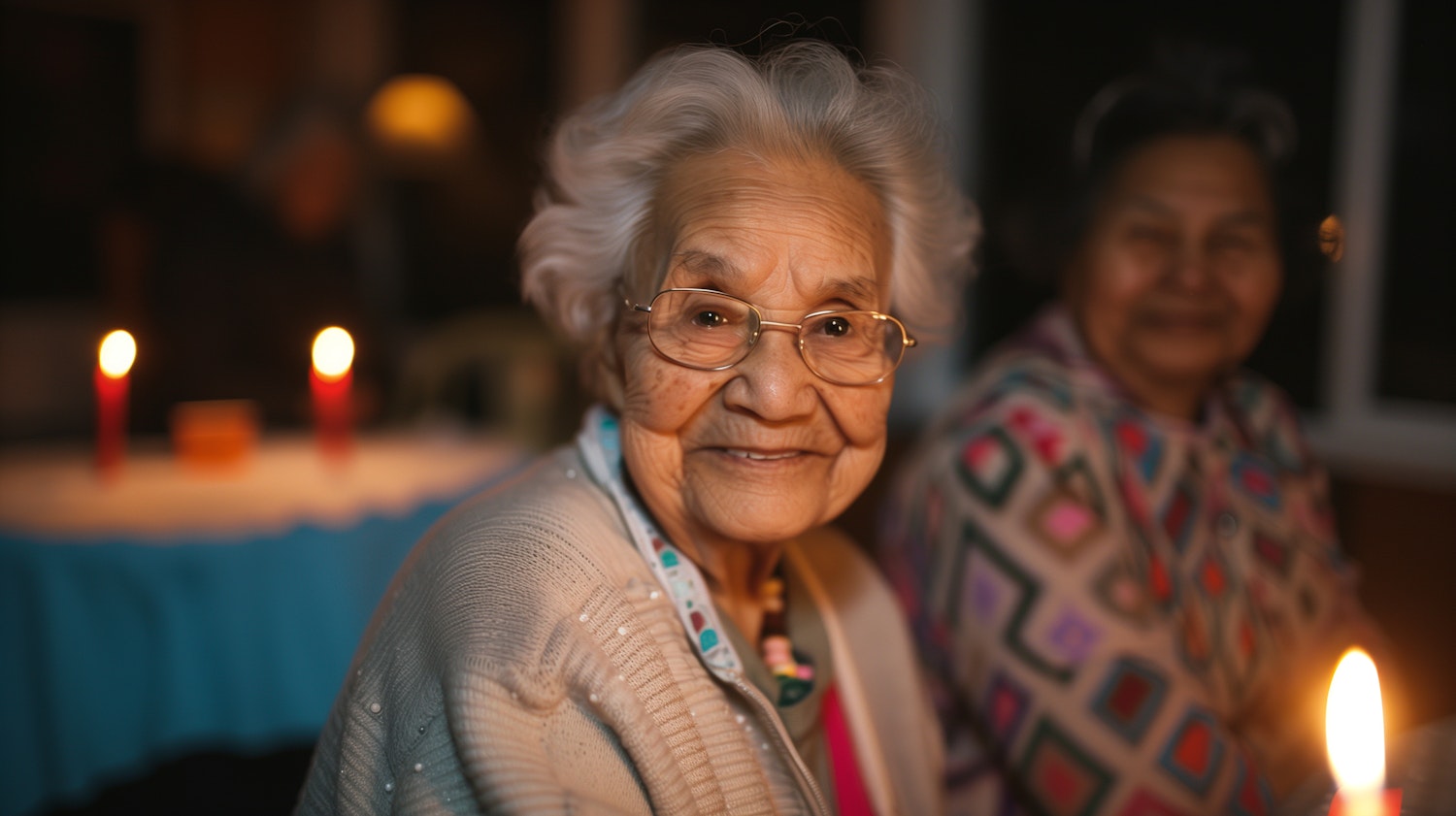 Elderly woman with white hair and glasses smiles warmly, surrounded by candlelight and a cozy atmosphere.
