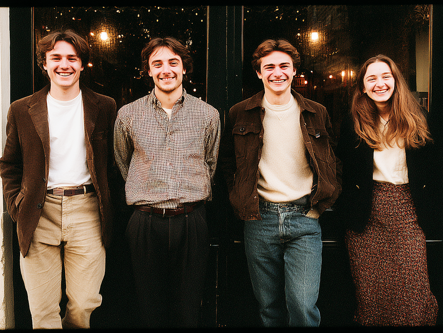 A group of four friends smiling warmly, dressed in casual attire, standing against a warmly lit background.