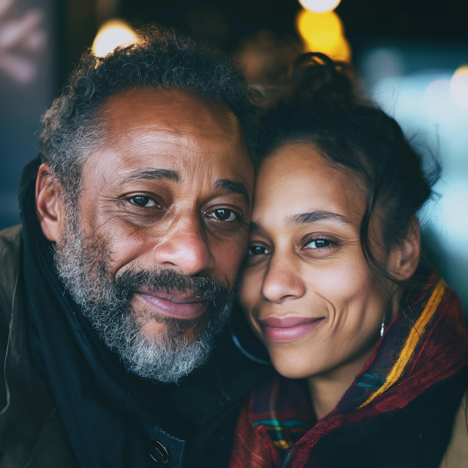 Close-up portrait of a smiling couple with warm lighting and a cozy atmosphere.