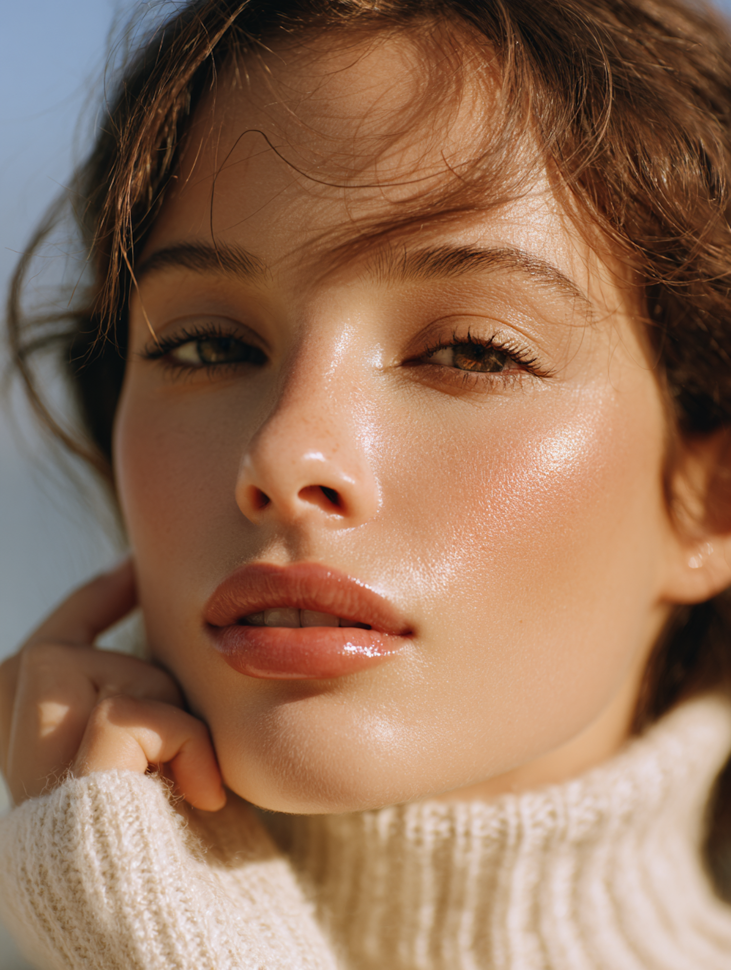 Close-up of a person with glowing skin and natural makeup, wearing a cream knit sweater, in warm lighting with a soft blurred background.