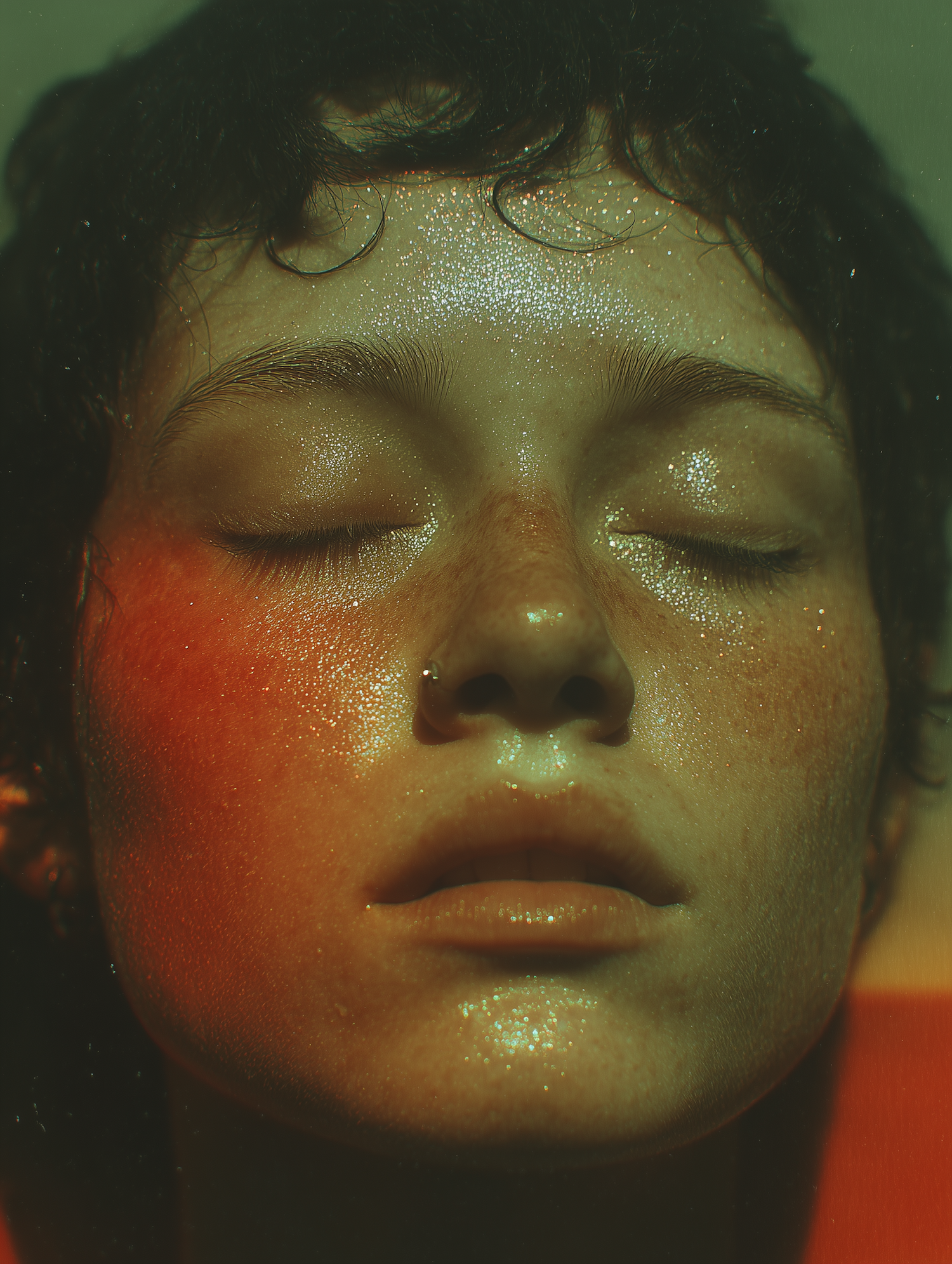 Close-up of a freckled face with dewy skin and warm lighting, showcasing a serene expression and artistic sparkle effect.