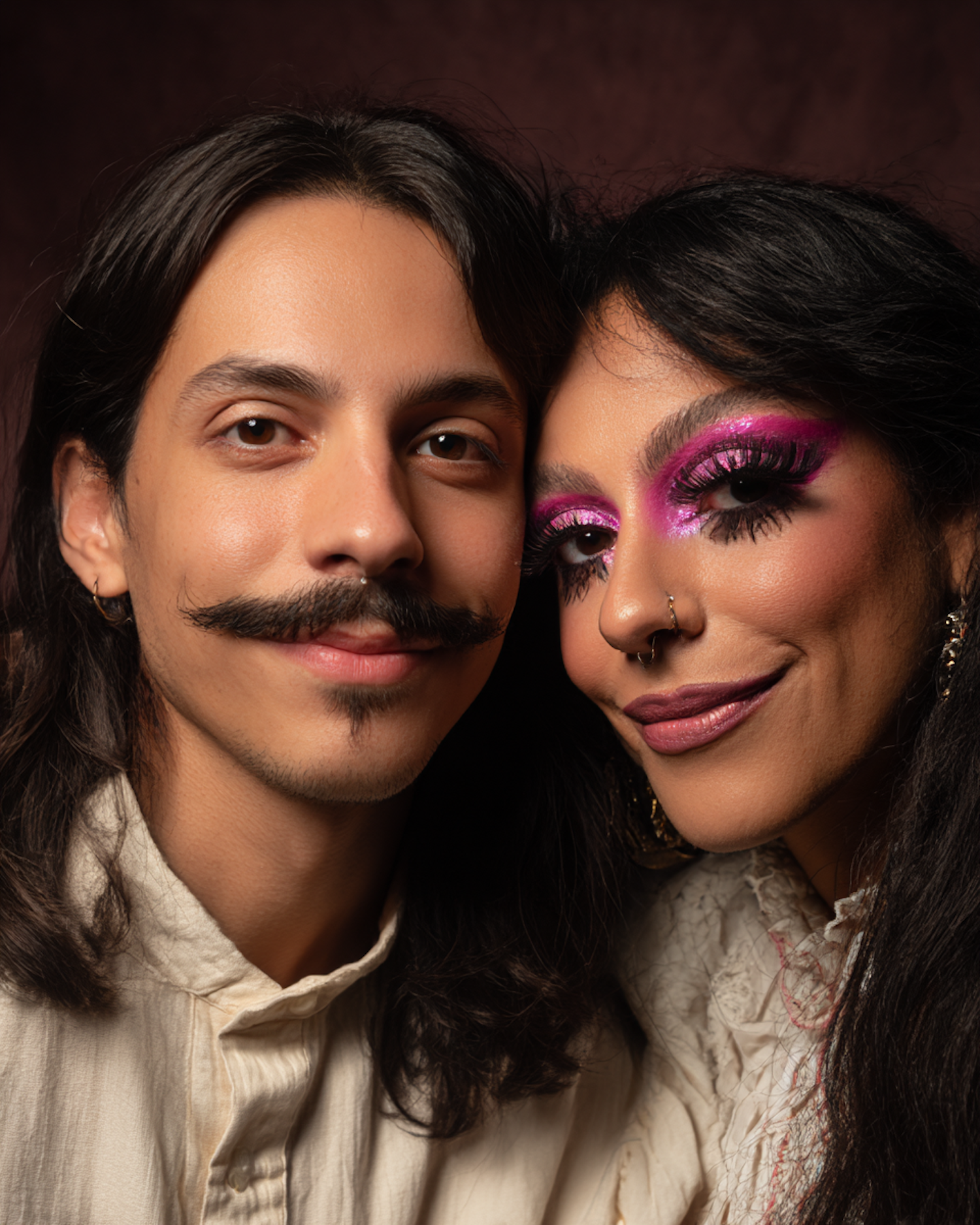 A close-up portrait of two individuals with unique styles, showcasing vibrant makeup and warm expressions against a soft background.
