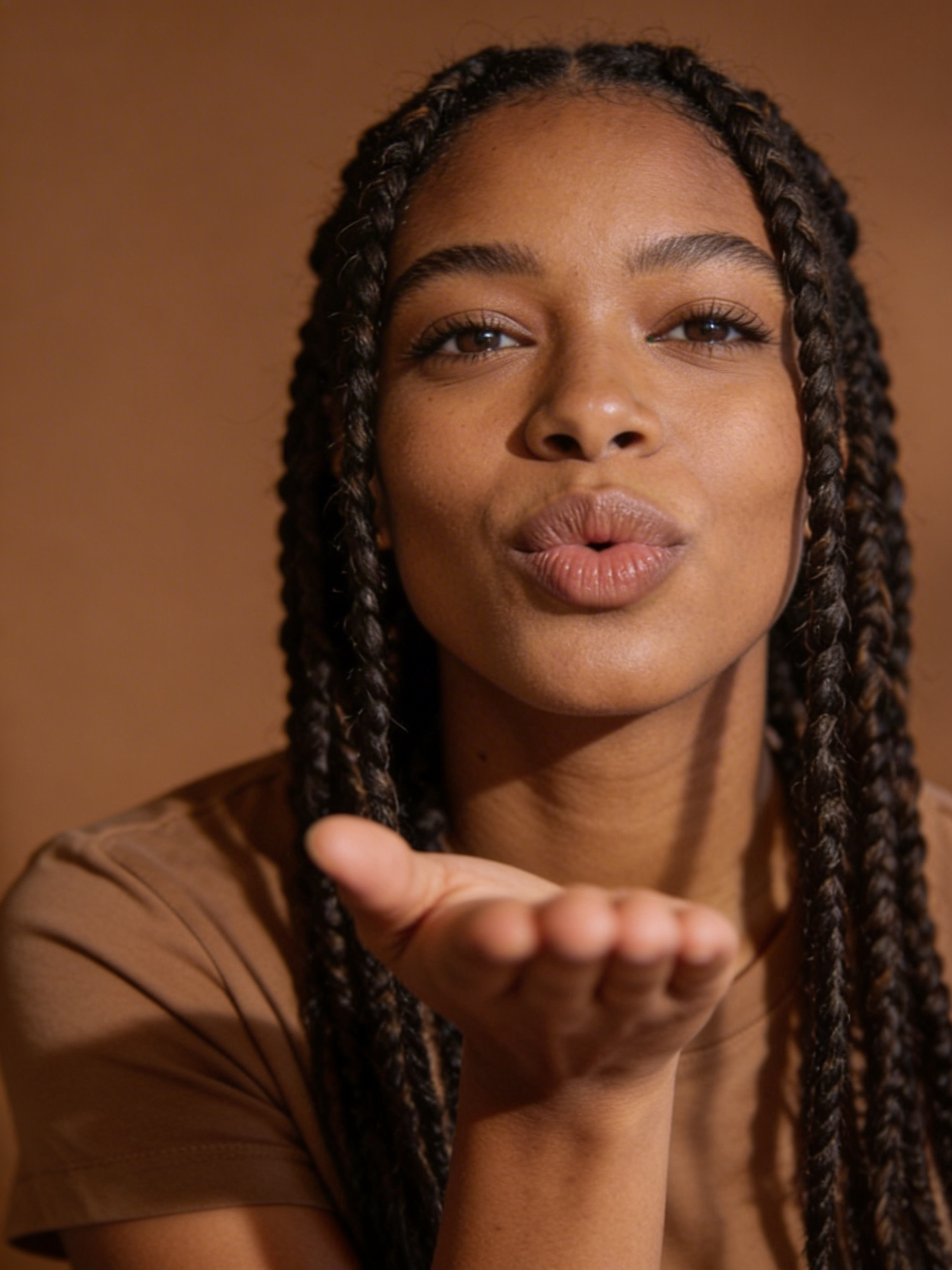 A close-up of a woman with braided hair blowing a kiss, set against a warm brown background, radiating warmth and affection.