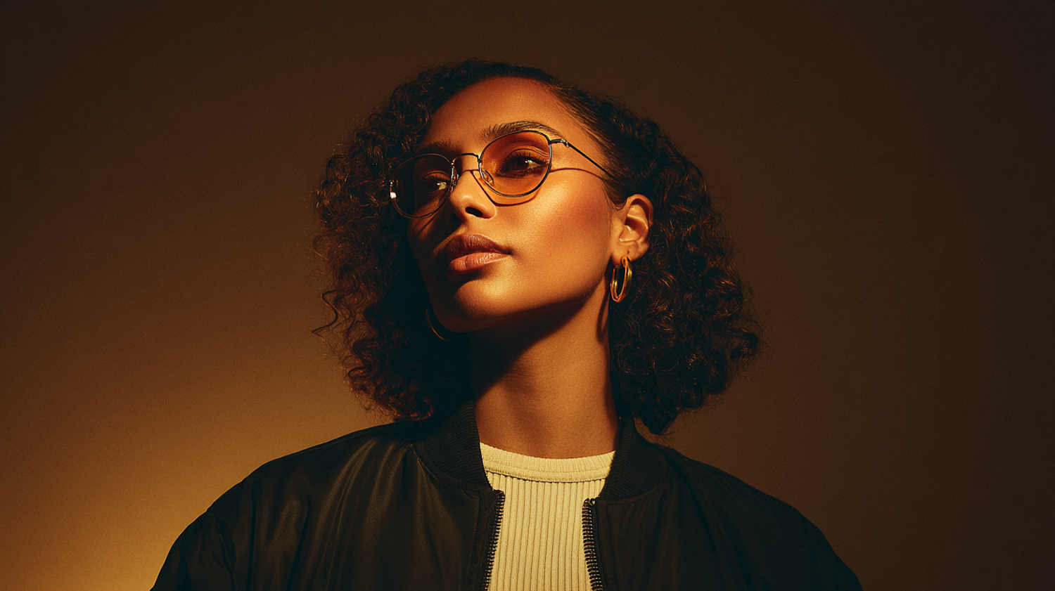 A warm-toned portrait of a person with curly hair, glasses, and hoop earrings, wearing a dark jacket over a light top, with a calm expression.