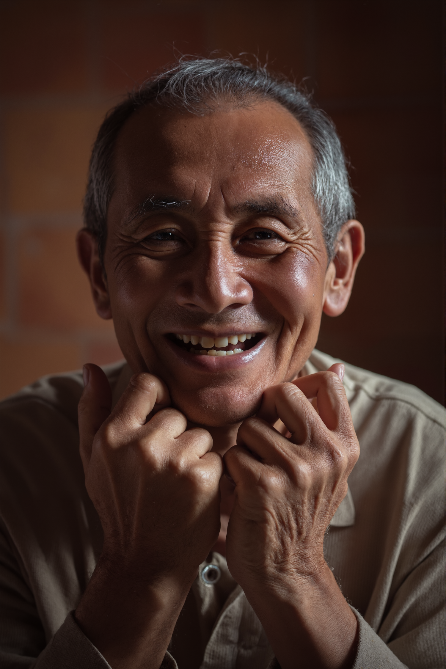 Close-up of a smiling older man with gray hair, warm lighting, and a beige shirt, radiating joy and character in a cozy setting.