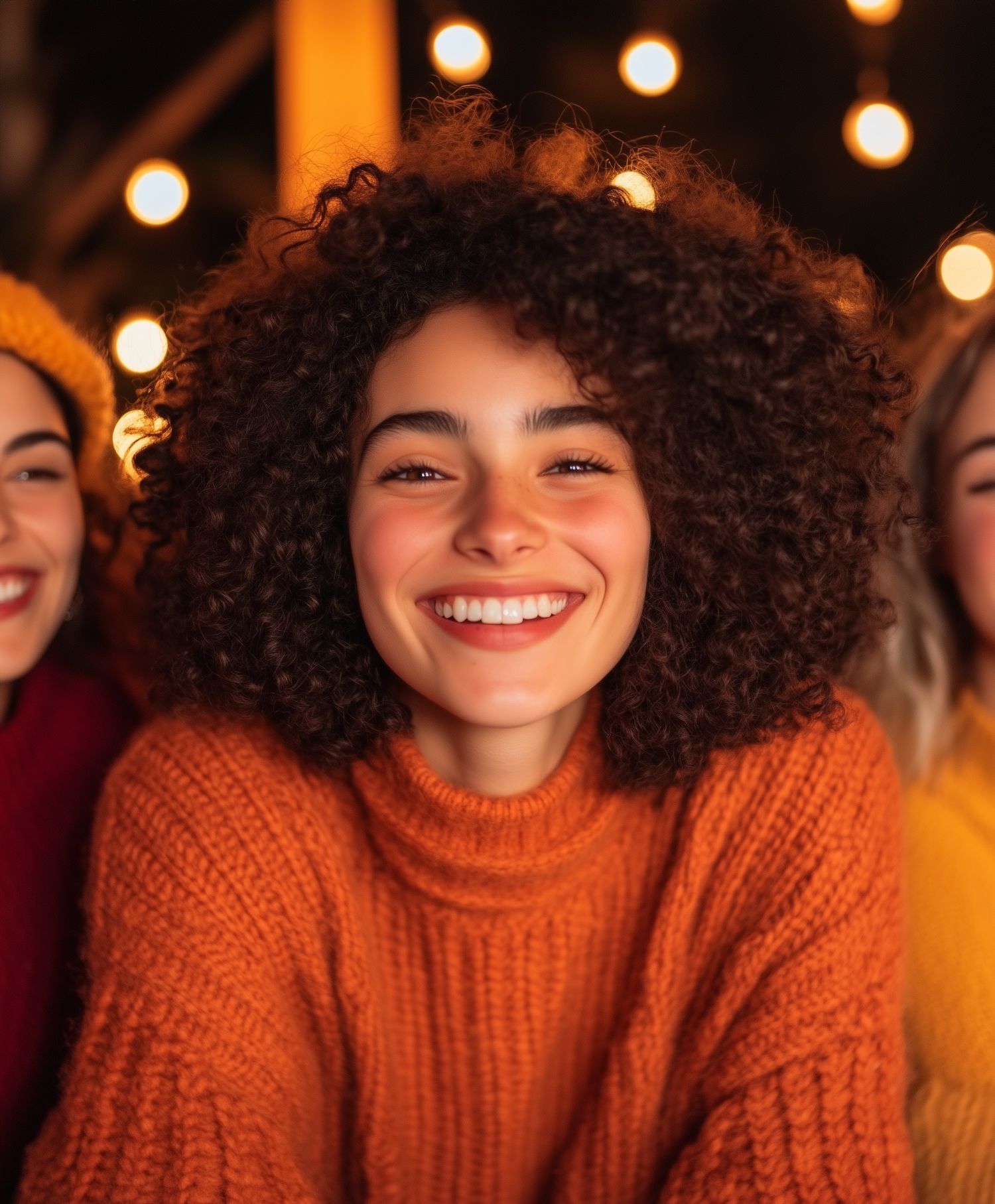 Smiling woman in an orange sweater with curly hair, surrounded by warm lights and friends in cozy sweaters, creating a festive atmosphere.