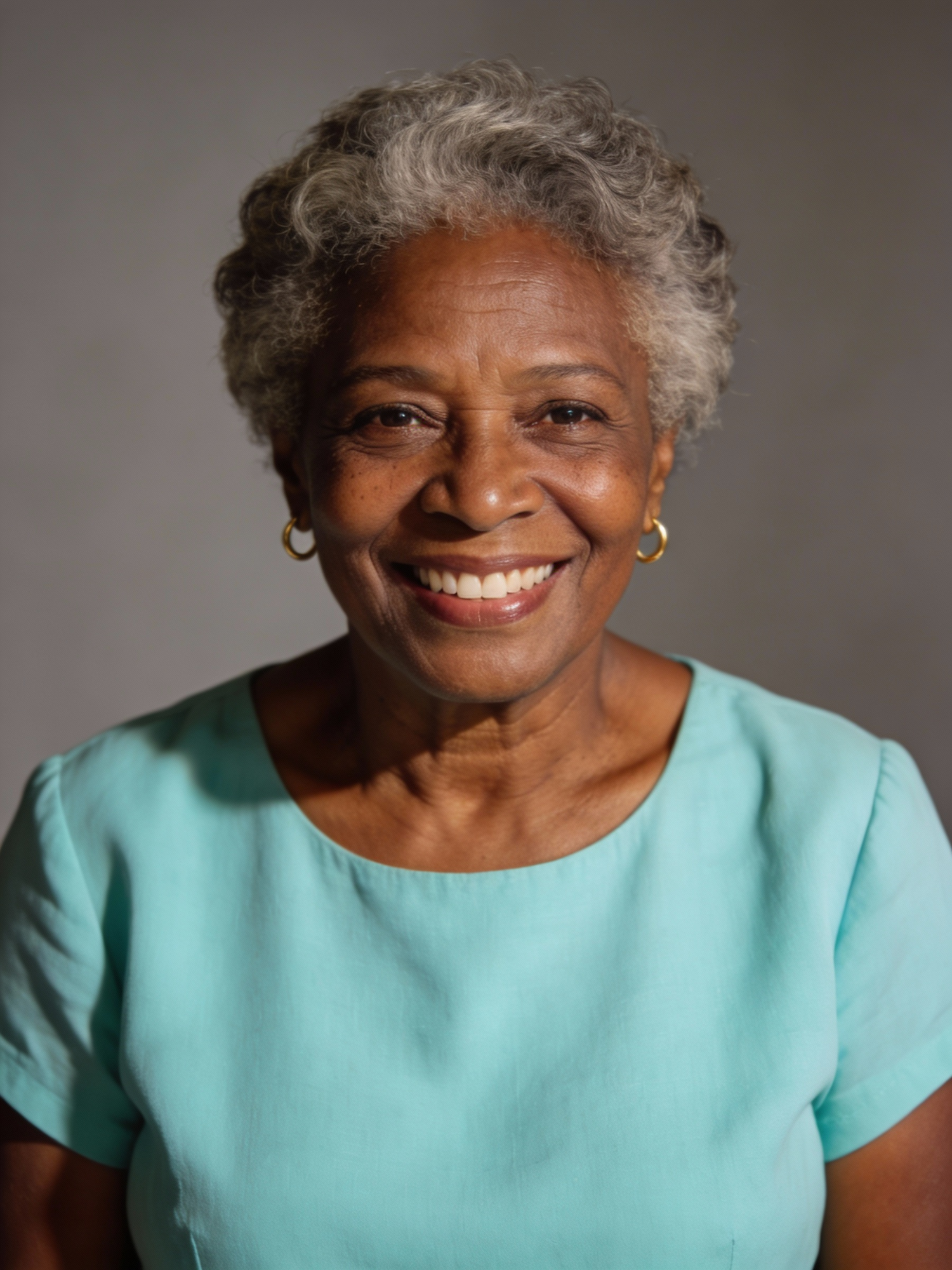 A smiling older woman with short gray hair, wearing a light blue blouse and gold earrings, against a neutral background.