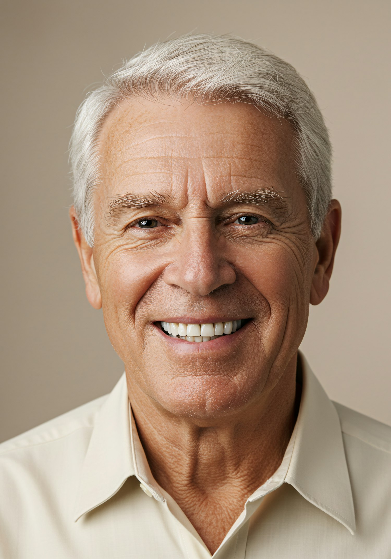 Close-up portrait of a smiling older man with white hair and a light shirt, set against a neutral beige background.