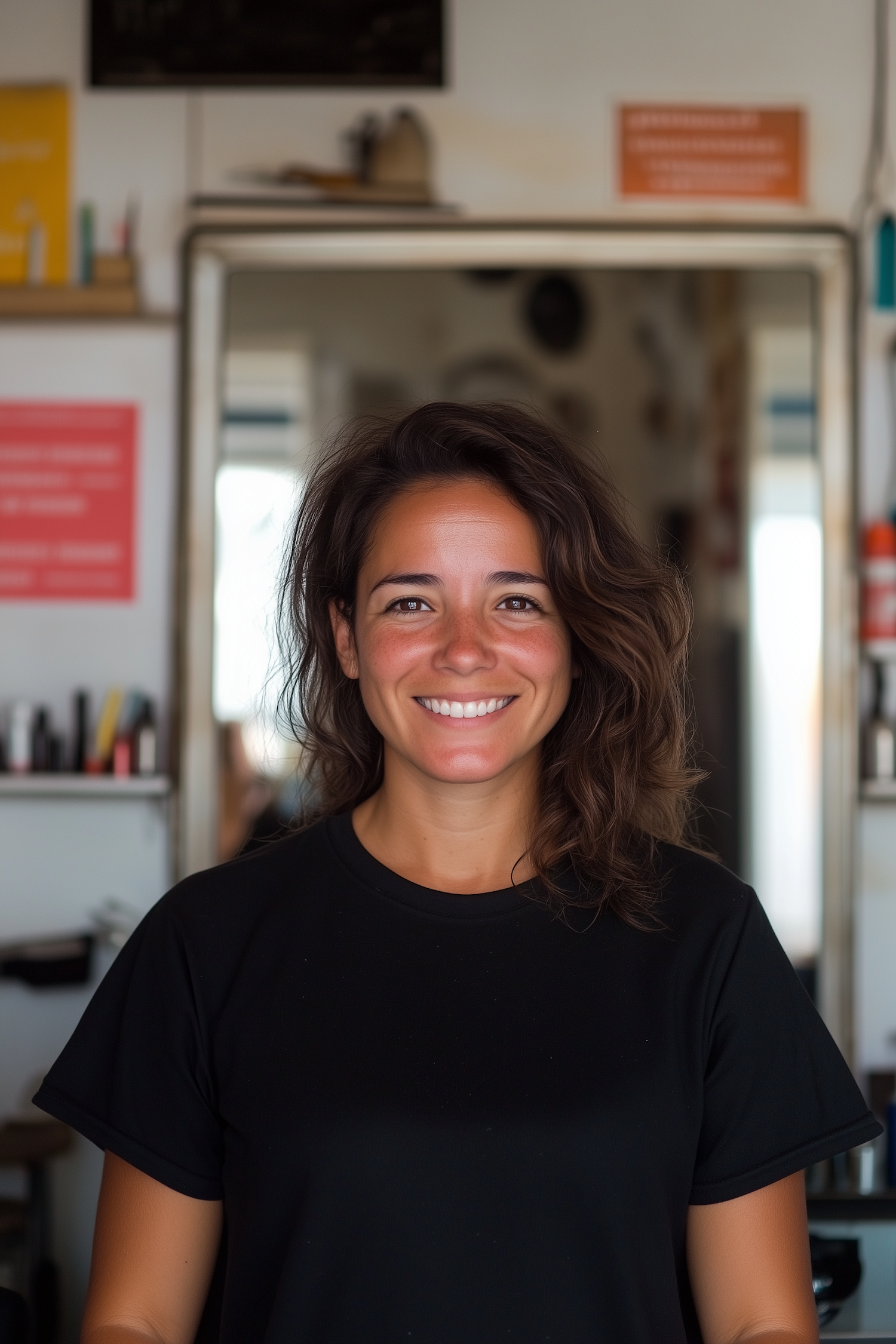 Smiling woman with wavy brown hair in a black t-shirt, standing in a salon with a mirror and shelves in the background.