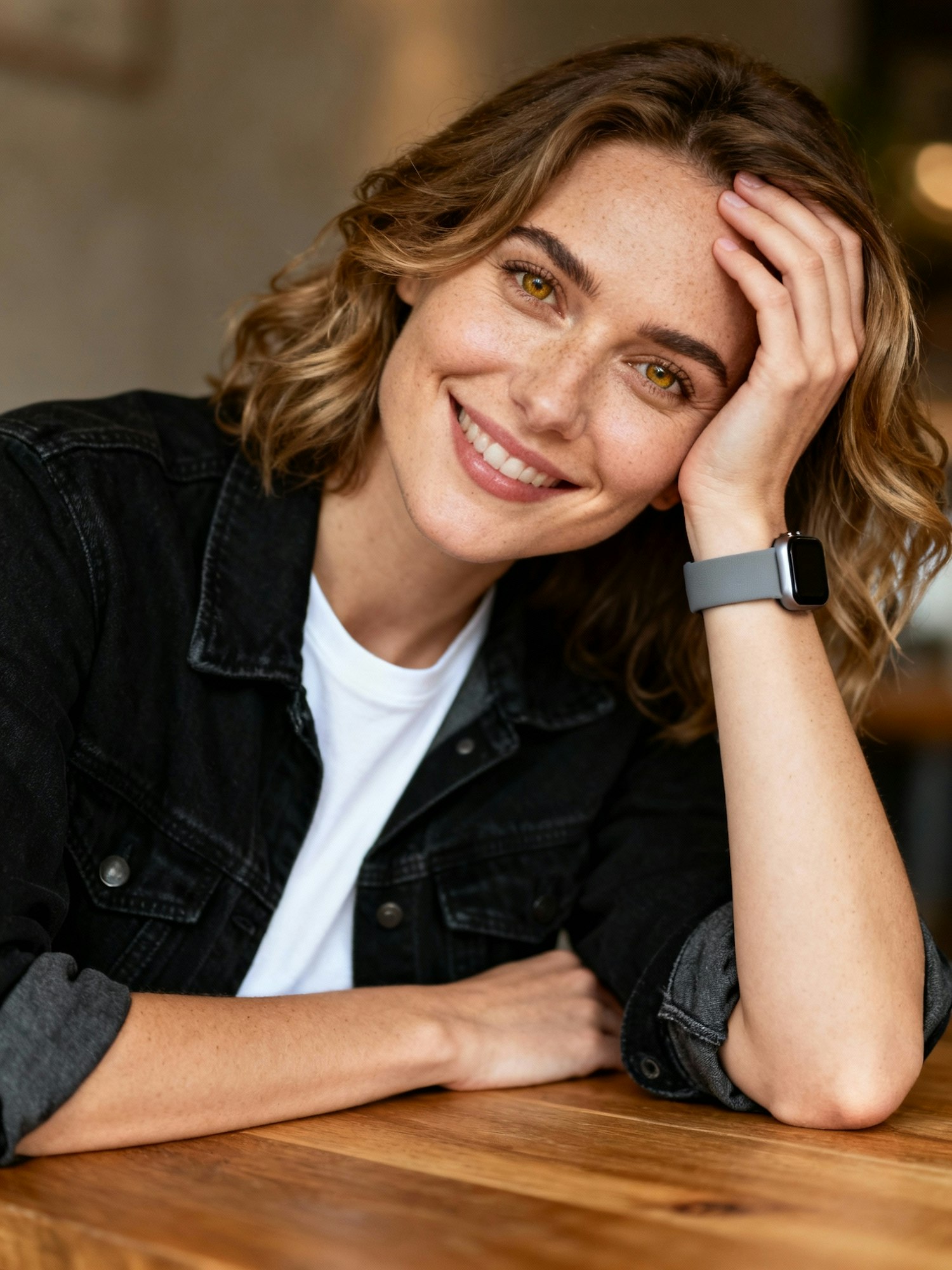 A hyper-realistic portrait of a woman sitting at a wooden table, leaning slightly forward with one arm resting on the table. She is wearing a black denim jacket with rolled-up sleeves, and inside the jacket, a white t-shirt. On her wrist, she has a smartwatch with a gray strap. Her head is tilted slightly, with one hand resting casually and comfortably on my forehead, her hair is styled, wavy, and light brown color, her eyes color is honey, her face looks natural, not that smooth and she has a soft smiley expression.