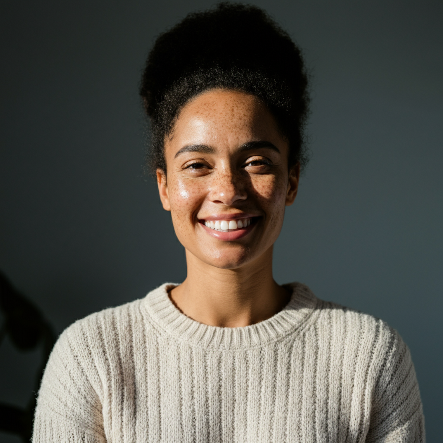 Smiling woman with curly hair in a cozy knit sweater against a gray background, showcasing natural beauty and warmth.
