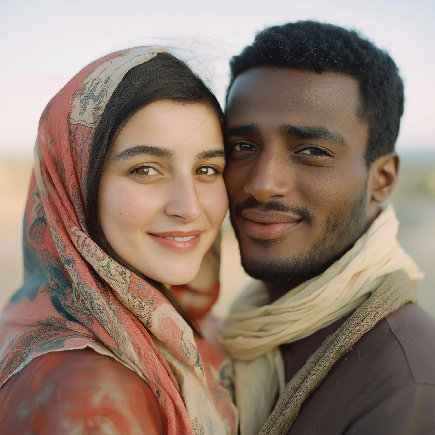 Close-up portrait of a smiling couple, embracing warmly with scarves, in a softly blurred outdoor setting.