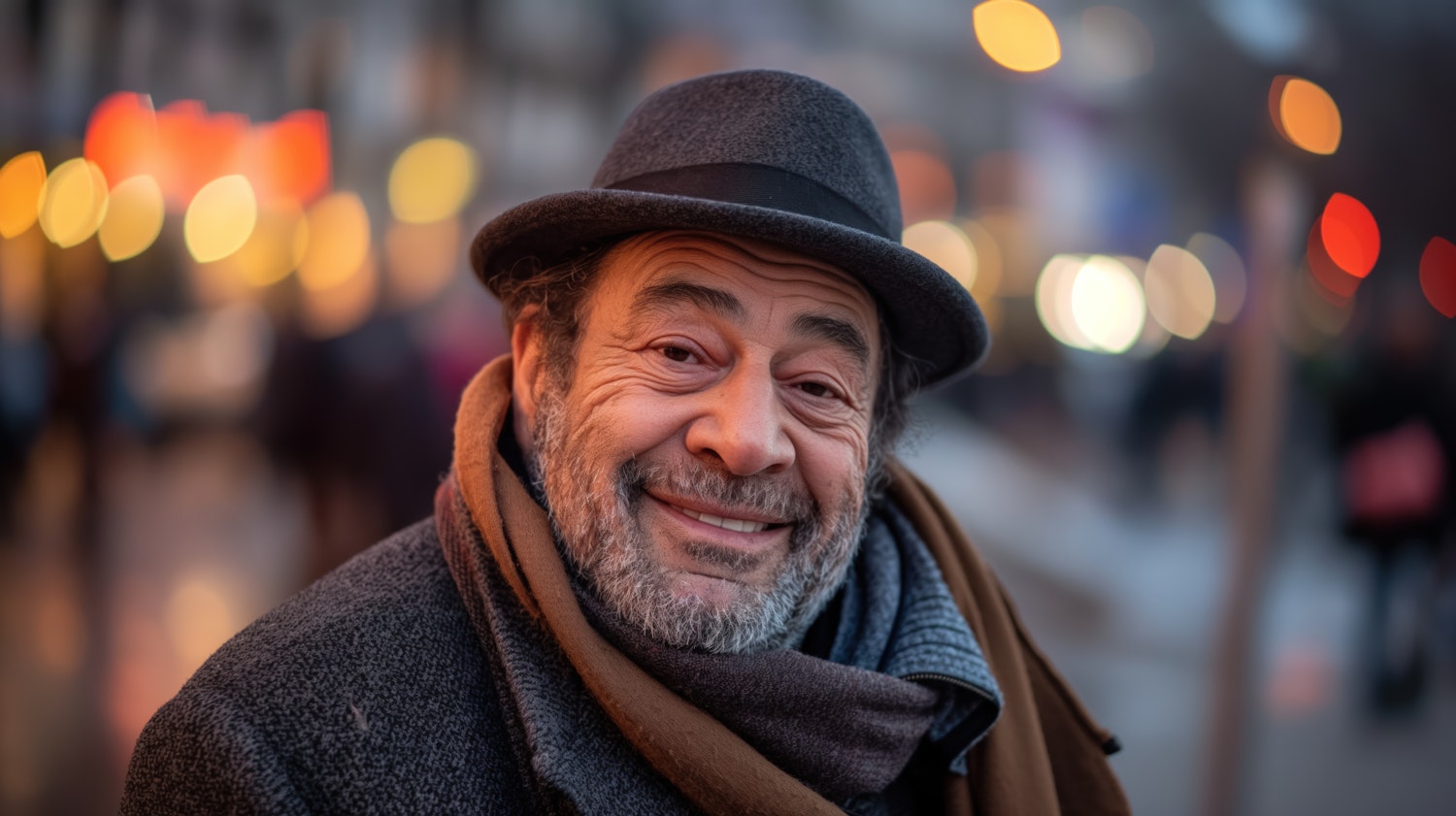 Smiling man in a gray fedora and coat, with colorful bokeh lights in the background, creating a warm and inviting urban scene.