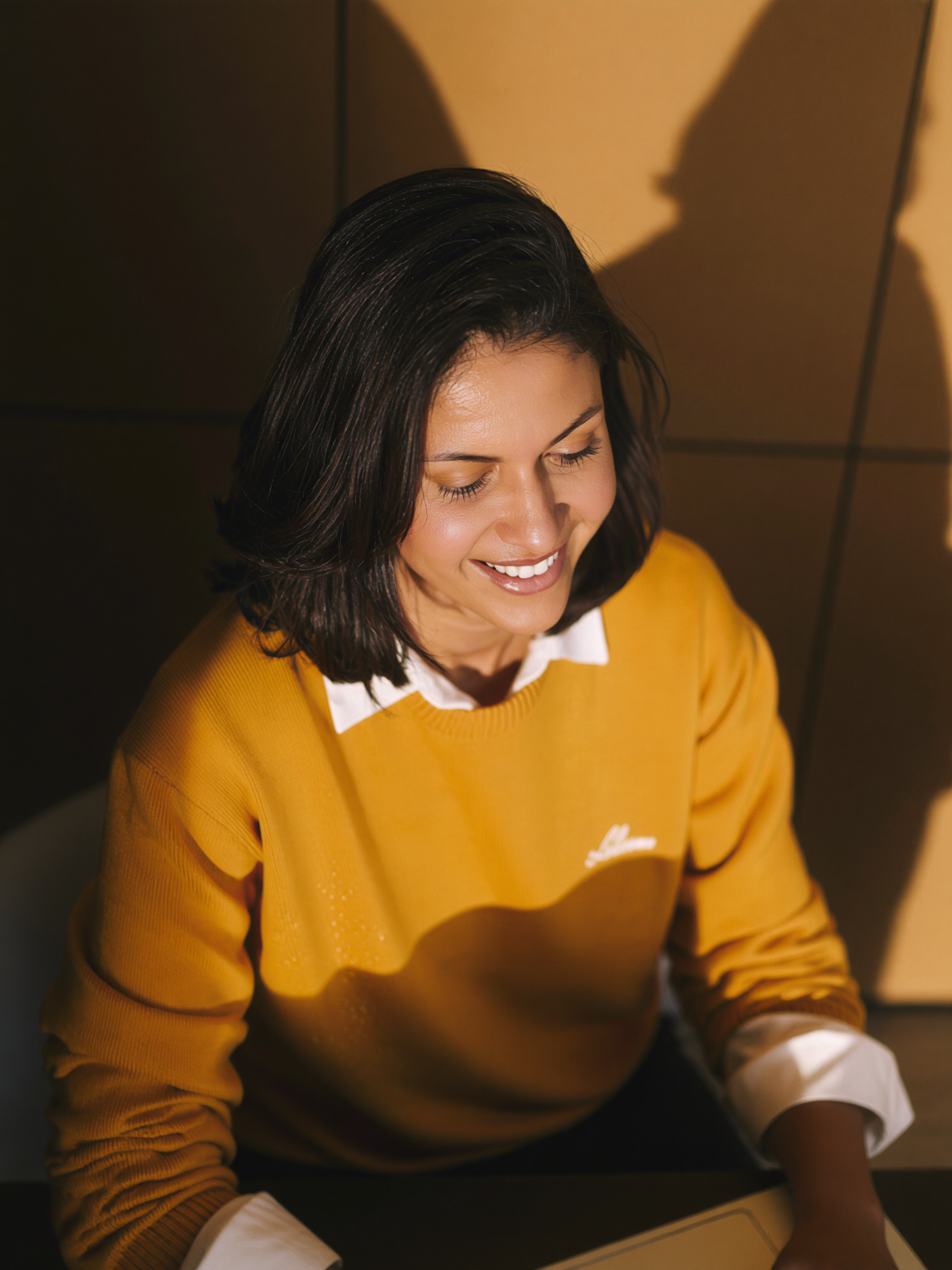 A woman in a mustard yellow sweater smiles warmly, bathed in soft light with shadows creating a cozy atmosphere.