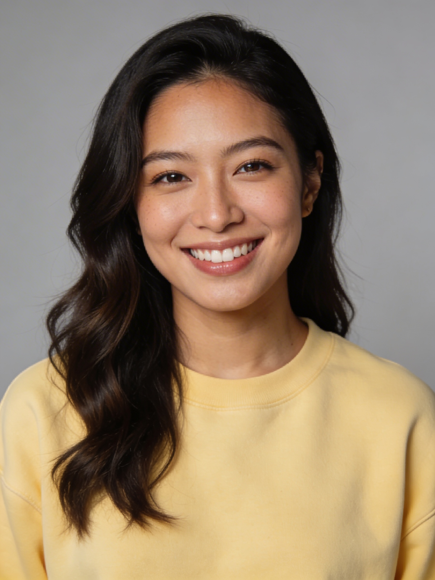 Studio portrait of a woman of Korean–Mexican heritage in her early 30s; light-medium warm skin tone; long dark hair with soft waves, side-parted; no visible jewelry; wearing a plain butter-yellow crewneck sweatshirt, no logos; neutral cool-gray seamless backdrop; Rembrandt lighting with soft fill; 105mm macro-sharp, f/7.1, ISO 100, ultra-high detail, crisp micro-contrast, no smoothing or blur. Expression: open friendly smile with natural teeth visible, authentic and relaxed. Framing: portrait orientation, 3:4 ratio; mid-chest-up, centered at eye level; full head and hair visible.