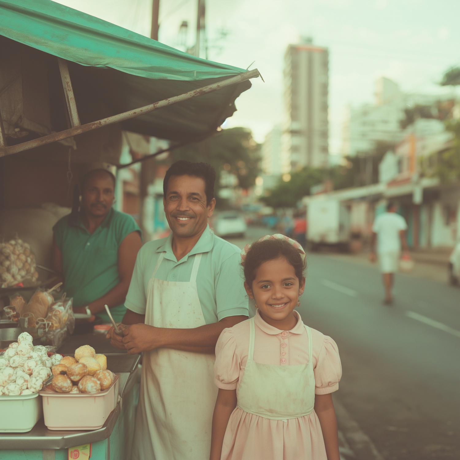 Smiling street vendors with pastries, featuring a man and a young girl in aprons, set against an urban backdrop.
