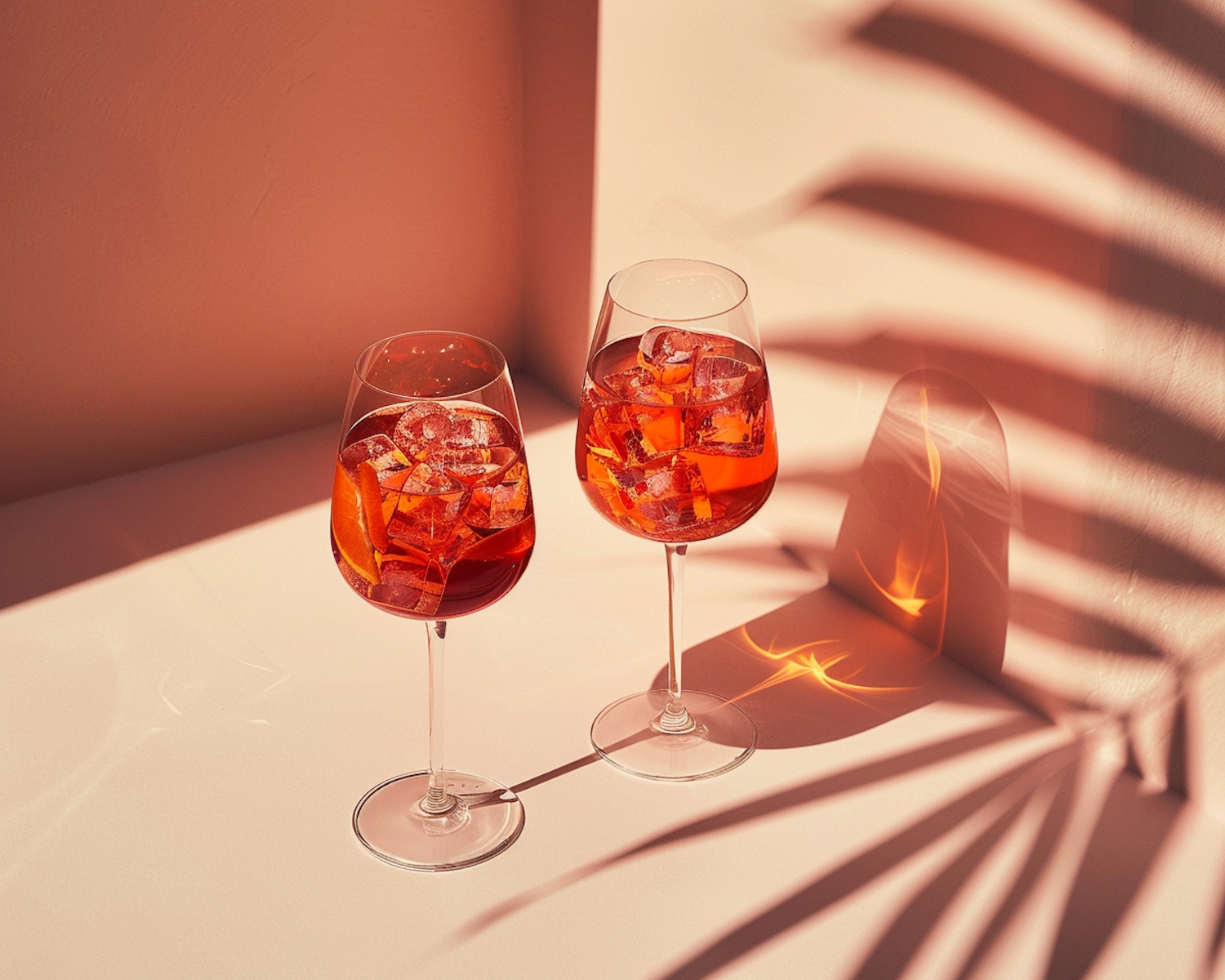 Two glasses of orange cocktail with ice and orange slices, casting palm leaf shadows on a light surface.