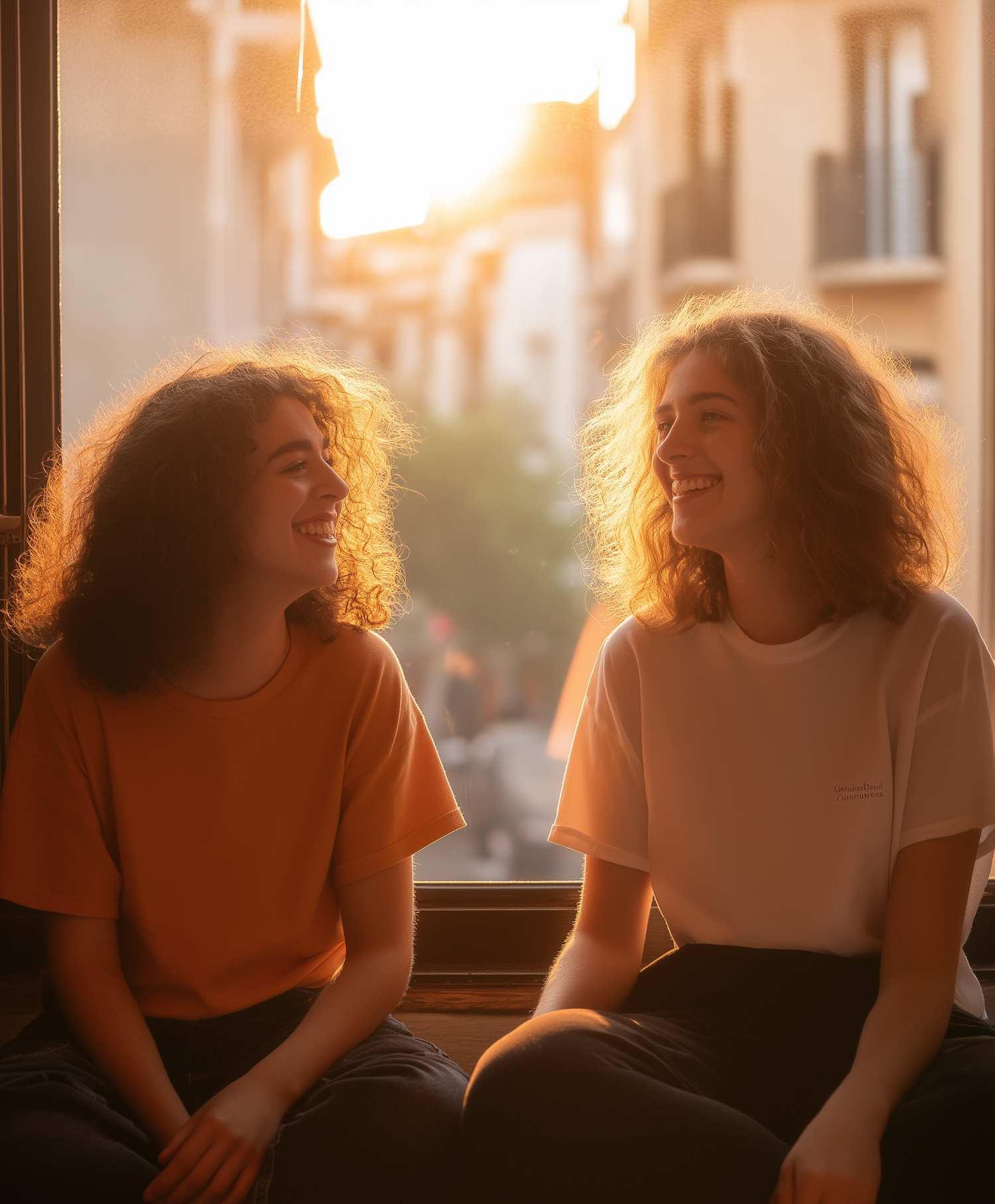 Two young women with curly hair share a joyful moment on a sunlit windowsill, wearing casual t-shirts in an urban setting.