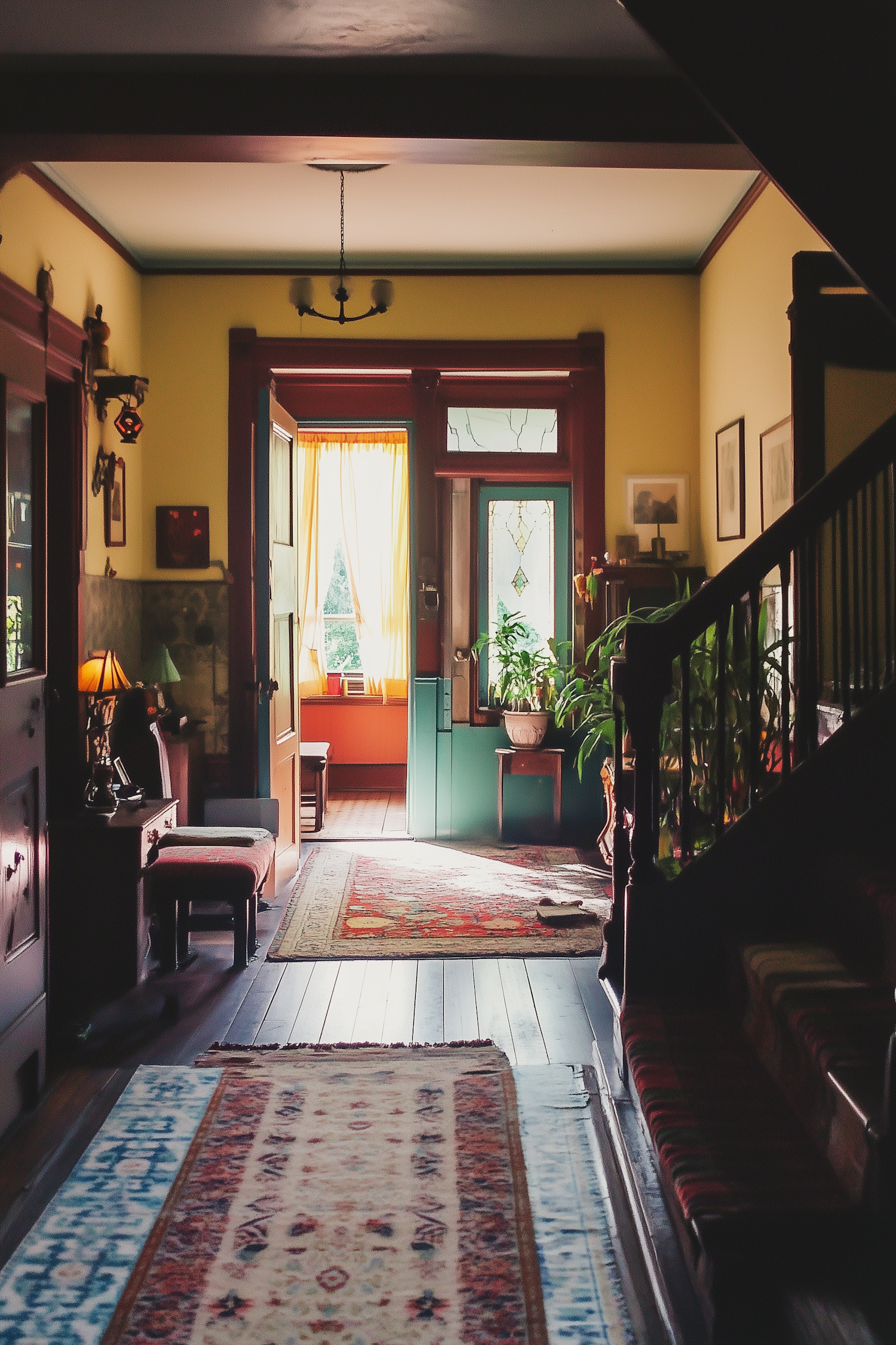 Warm, inviting hallway with wooden floors, colorful rugs, and vintage decor leading to a sunlit room with orange curtains.