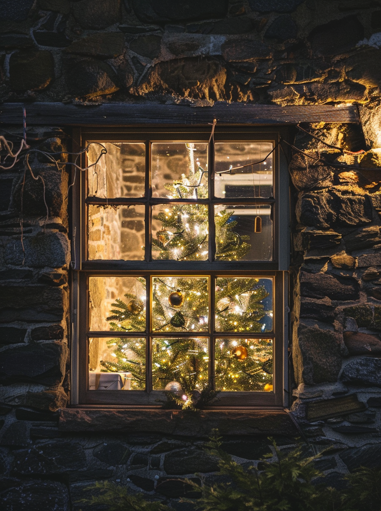 Cozy Christmas tree with golden ornaments and twinkling lights seen through a rustic stone window, evoking festive warmth.