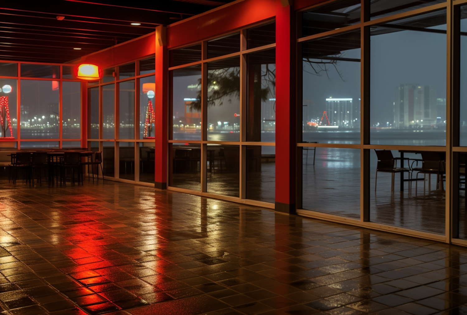 Cozy indoor space with red lighting, wet reflective floor, and cityscape view through large windows. Serene and inviting atmosphere.