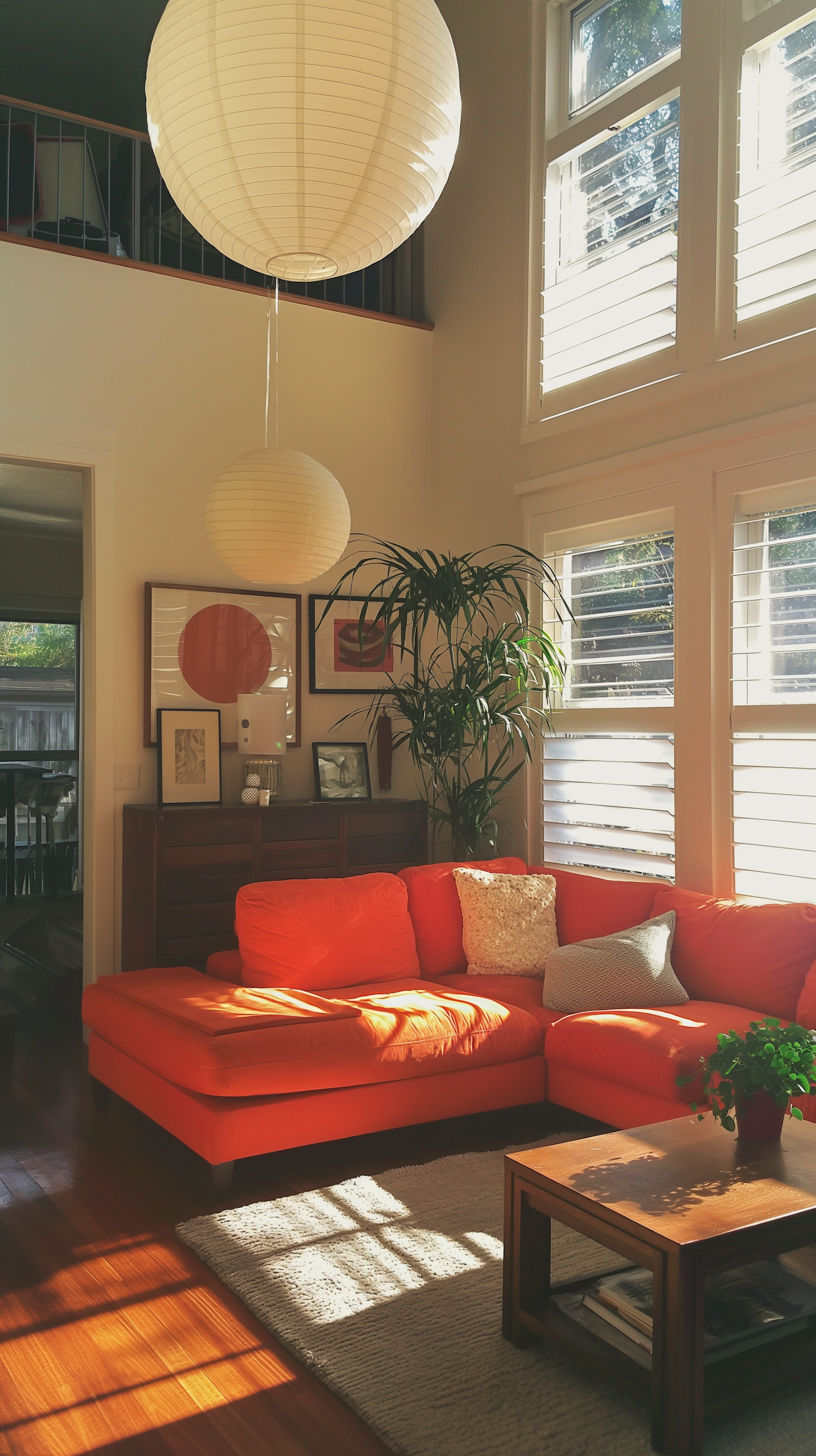 Sunlit living room with orange sofa, wooden coffee table, and paper lanterns. Modern decor with green plants and framed art.