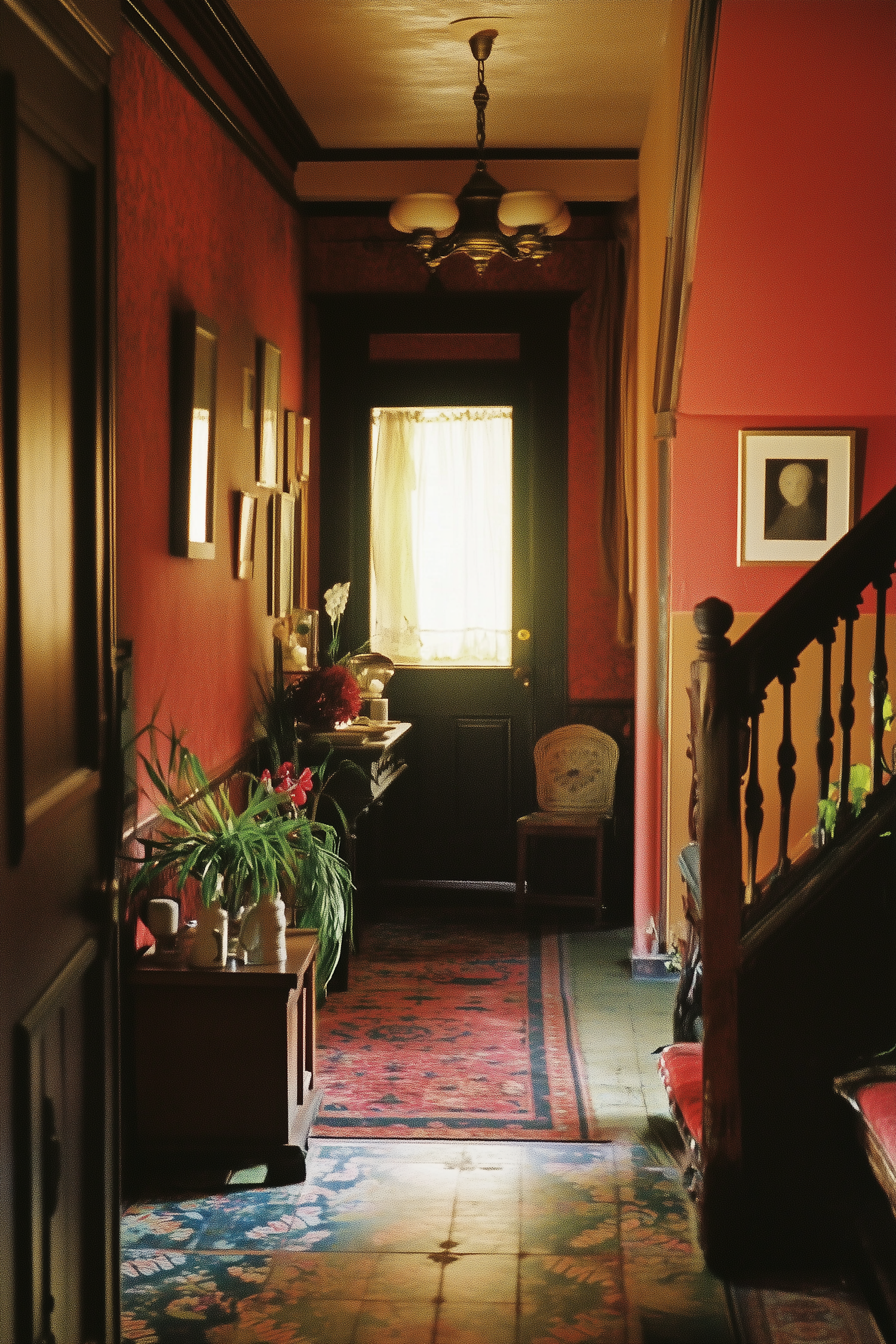 Warm hallway with red walls, patterned rug, and wooden staircase. Cozy decor includes plants and framed pictures.