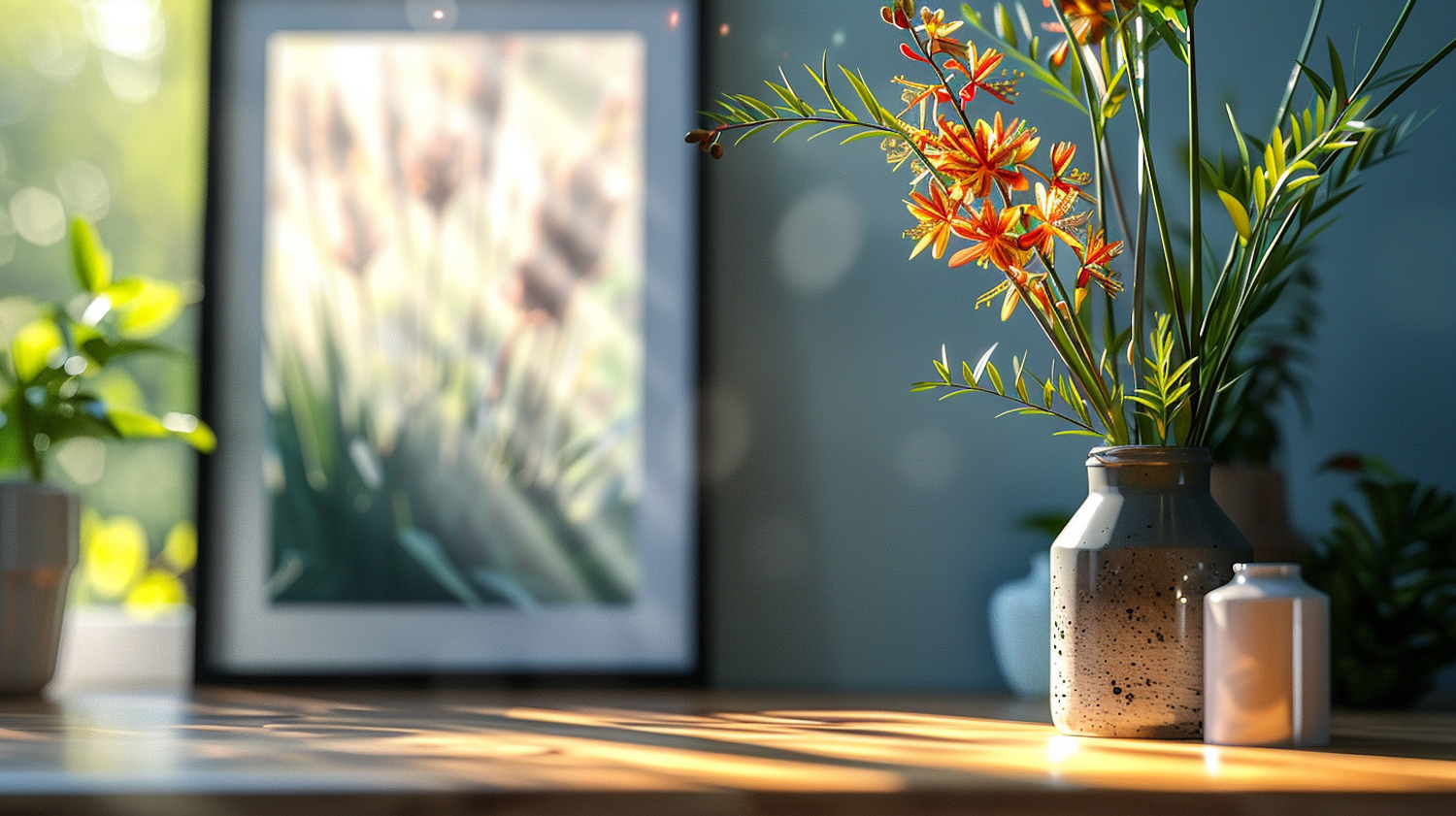Vibrant orange flowers in a speckled vase, bathed in sunlight, create a serene and elegant scene with a warm, inviting atmosphere.