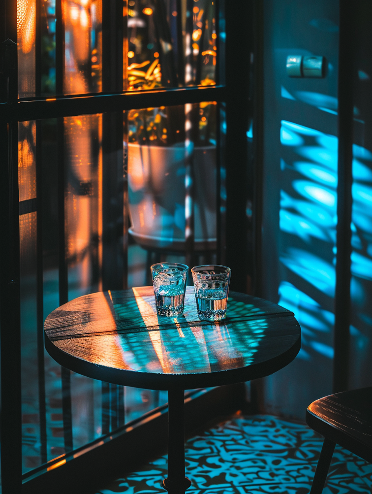 Cozy table setting with two glasses of water, bathed in warm orange and cool blue light, creating a serene ambiance.