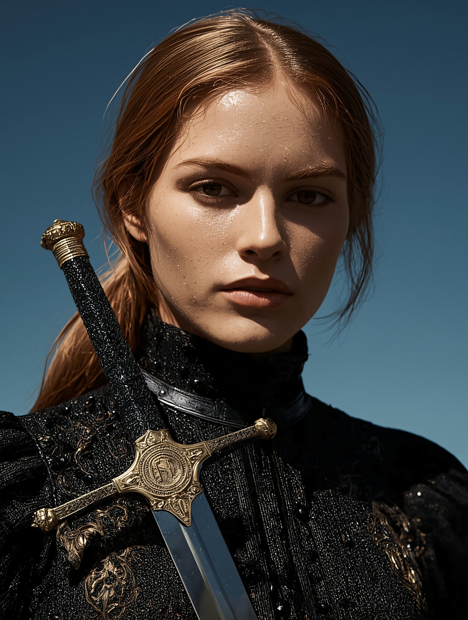 Close-up of a woman in a black outfit holding a sword with a golden hilt, set against a clear blue sky.