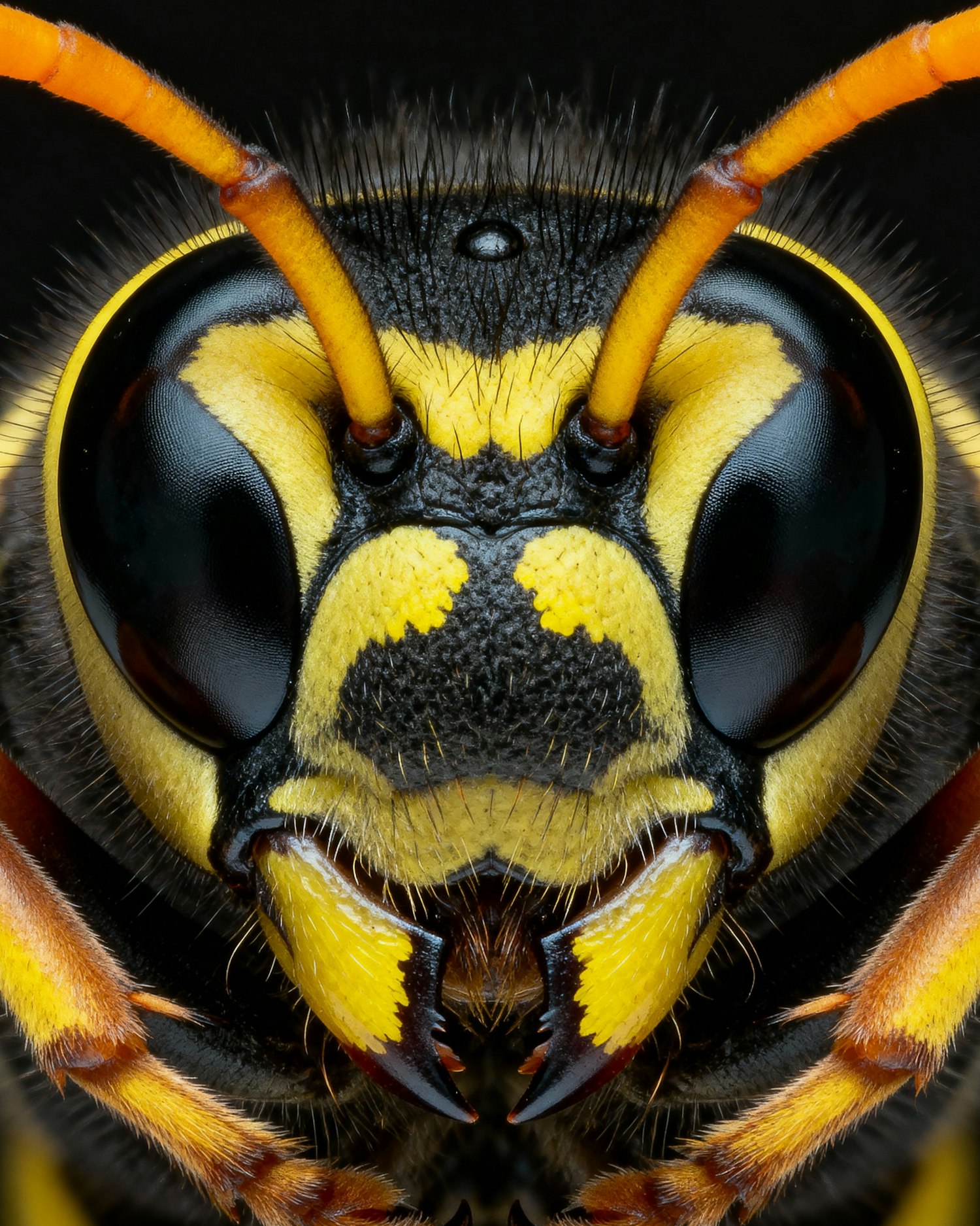 Macro close-up of a wasp's face, highlighting its compound eyes, antennae, and mandibles with vivid yellow and black patterns.