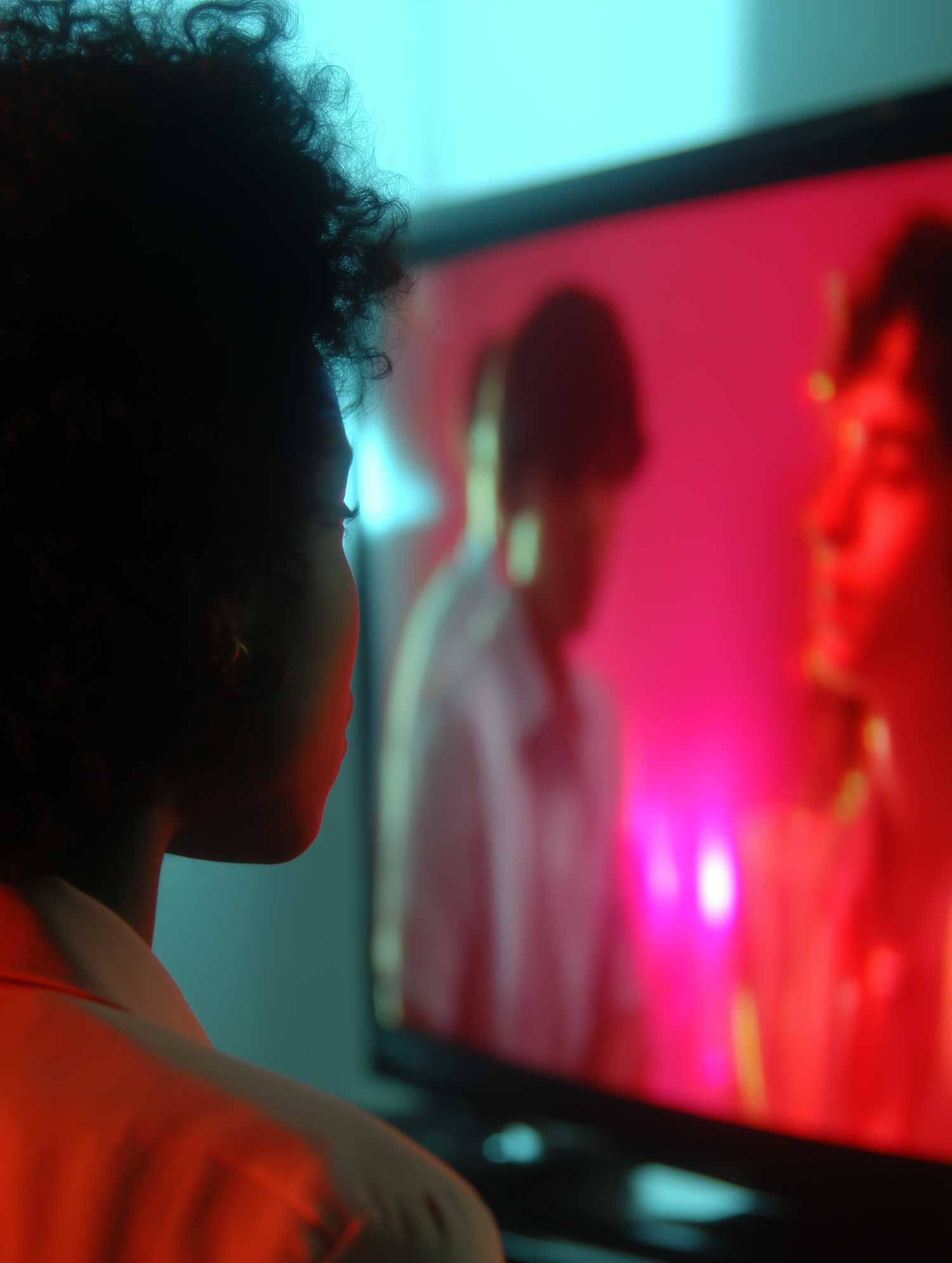 A person with curly hair watches a vibrant, red-toned scene on a TV screen, surrounded by teal and red ambient lighting.