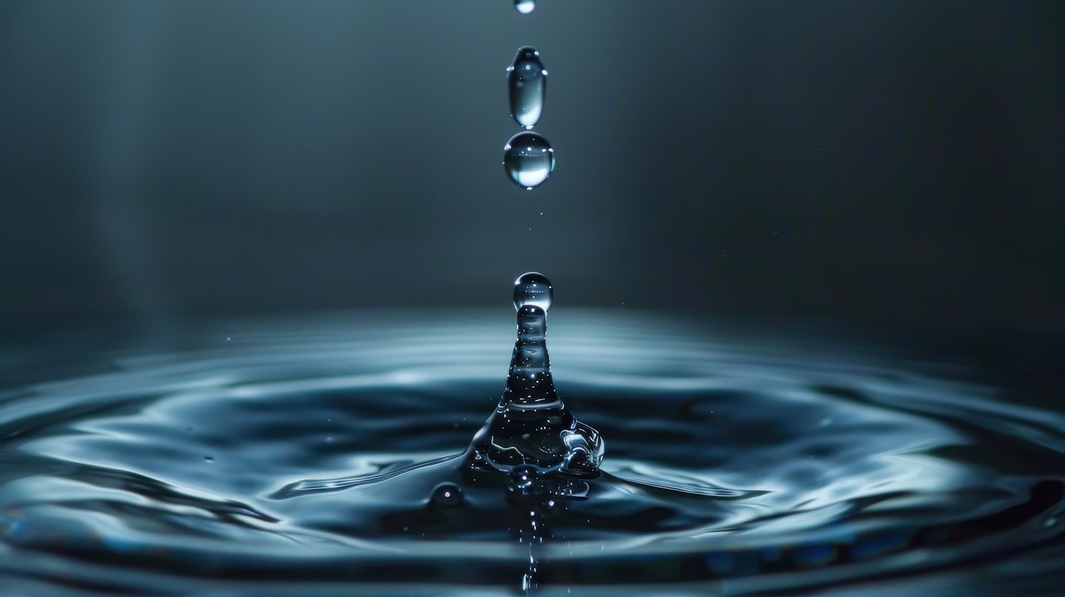 Close-up of a water droplet creating ripples in a dark, reflective pool. Captures the serene beauty of fluid motion.