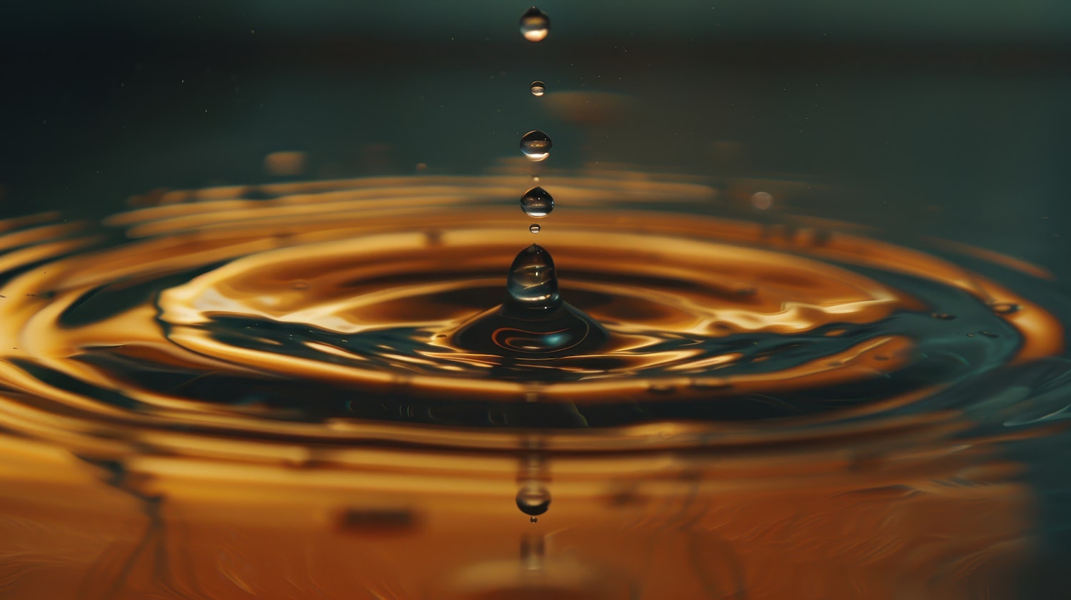 Captivating close-up of water droplets creating ripples in a golden-hued liquid, showcasing nature's beauty and motion.