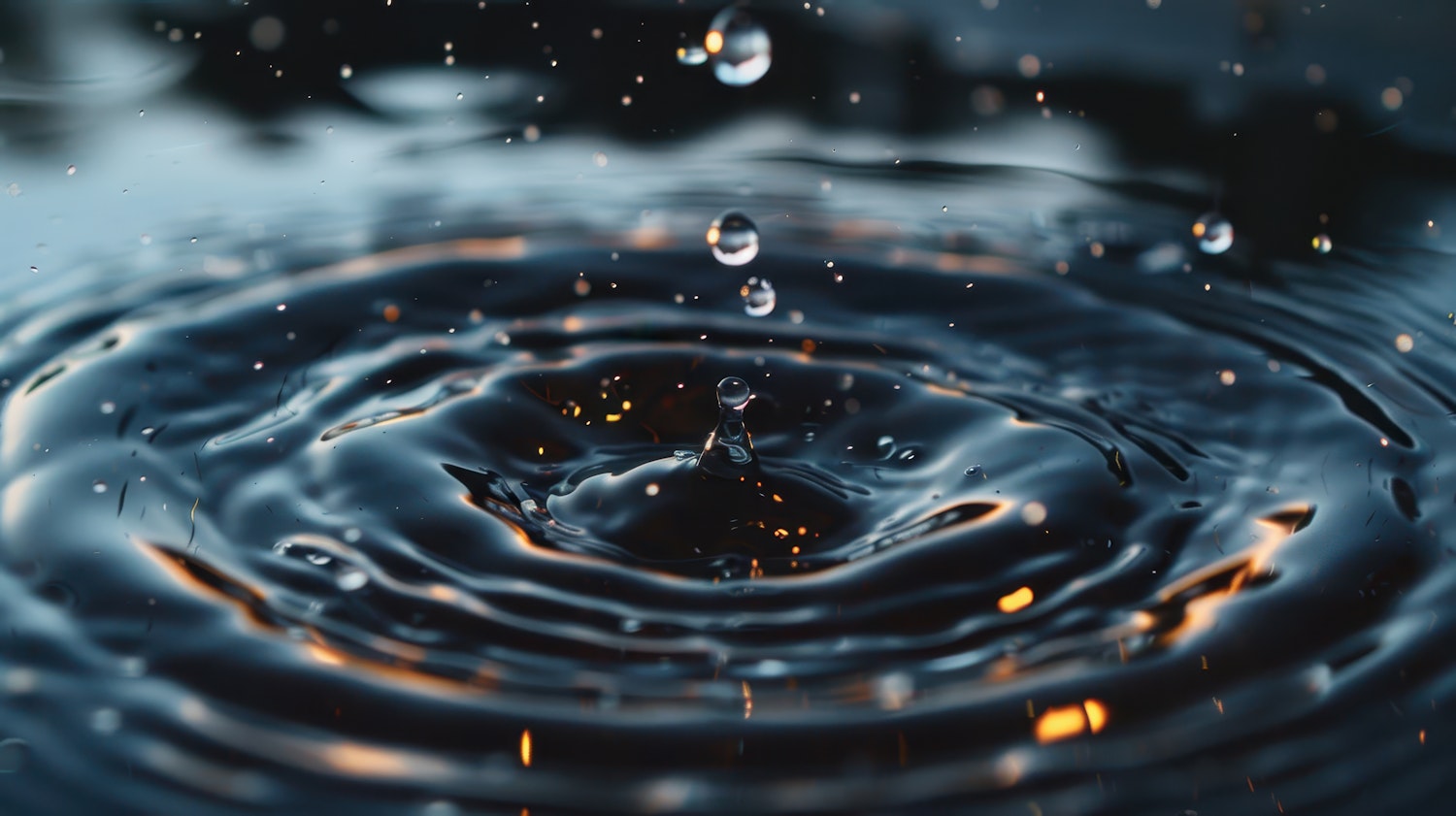 Close-up of water droplets creating ripples on a dark surface, with golden reflections and dynamic motion captured beautifully.