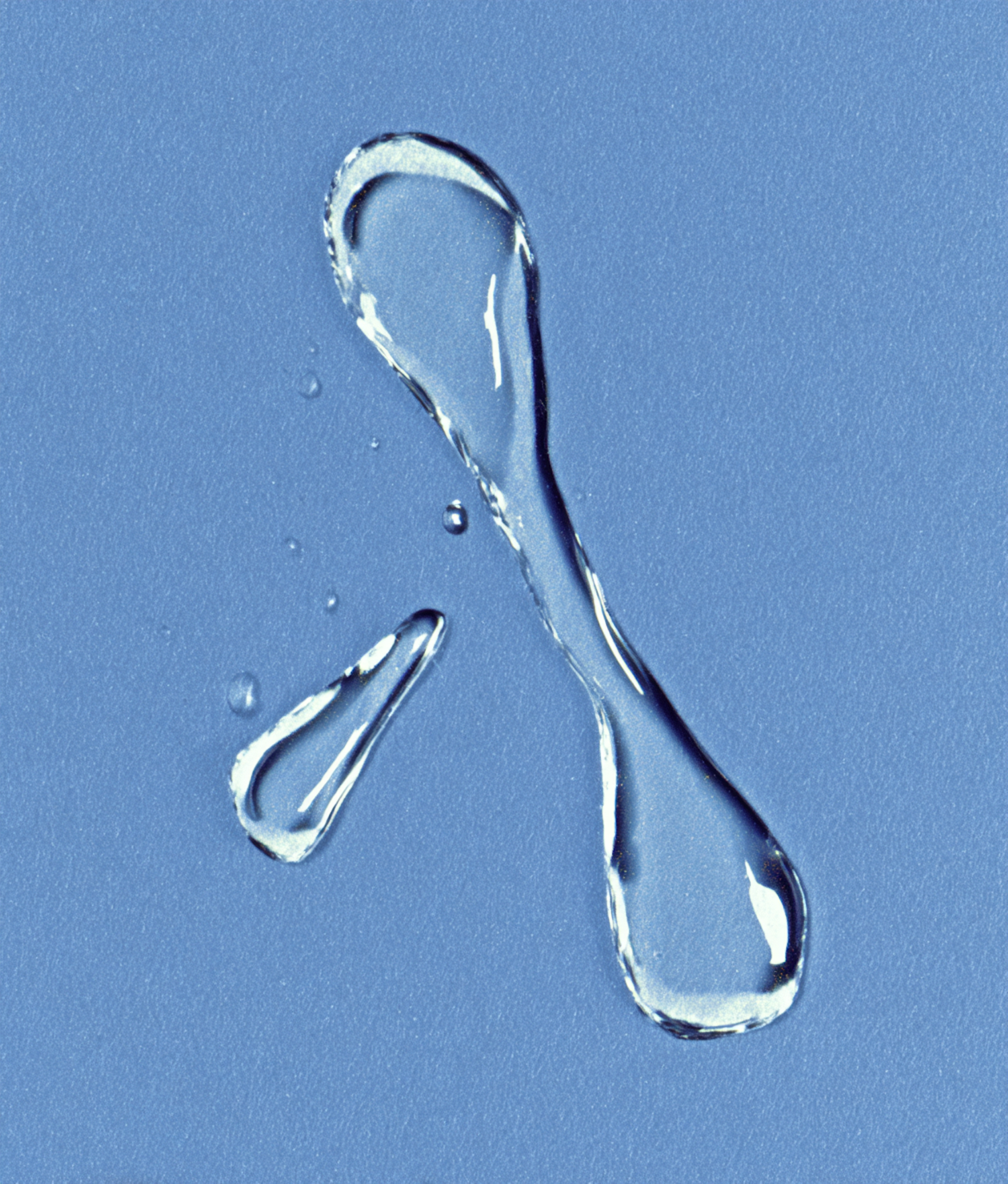 Close-up of clear water droplets on a smooth blue surface, showcasing their reflective and natural beauty in a minimalistic style.