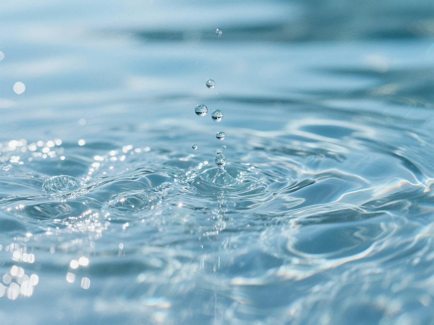 Close-up of water droplets splashing on a calm surface, with sunlight reflections creating a sparkling effect. A serene and refreshing scene.