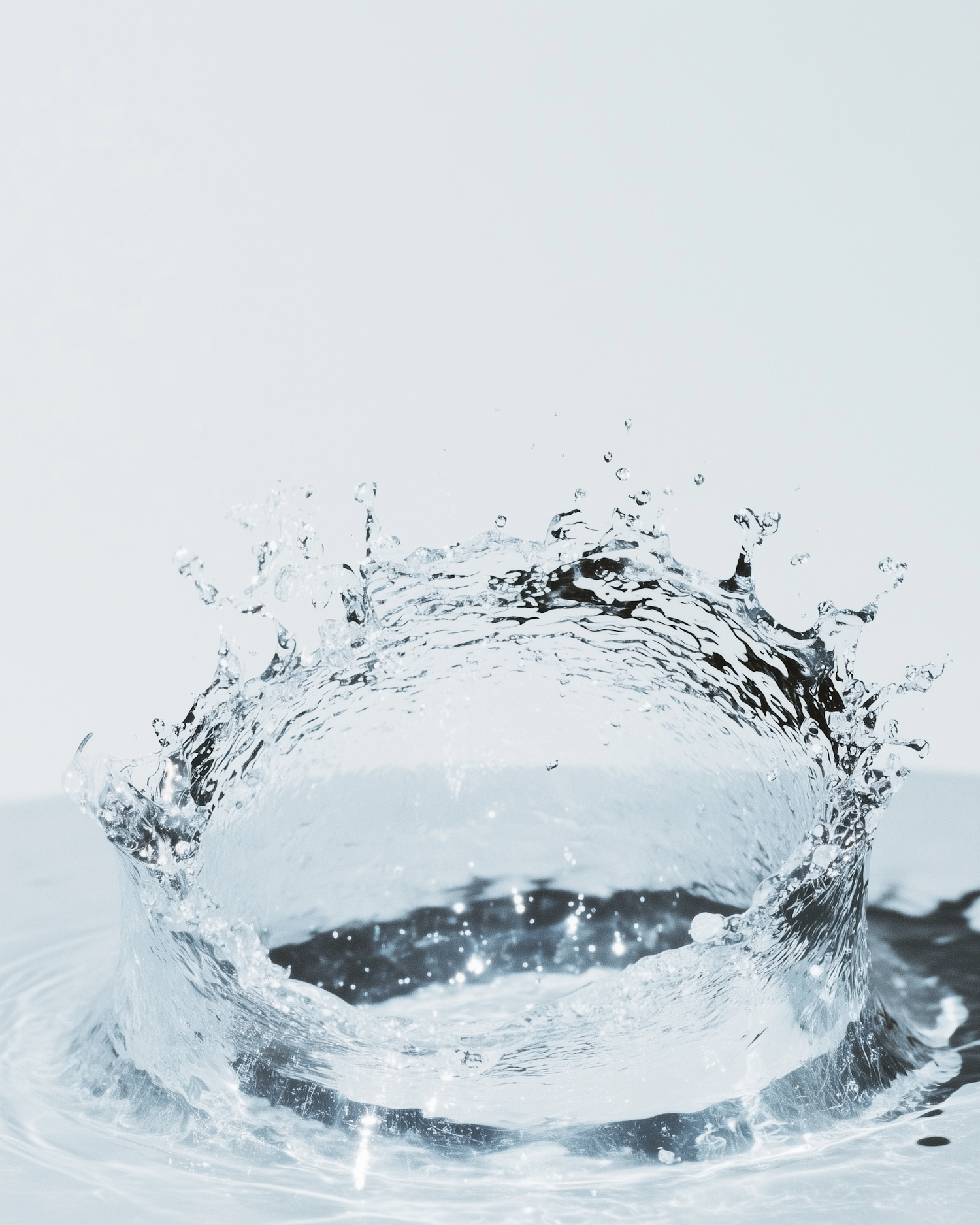 A stunning close-up of a water splash frozen mid-air, forming a crown shape with sparkling droplets and ripples in a minimal light background.