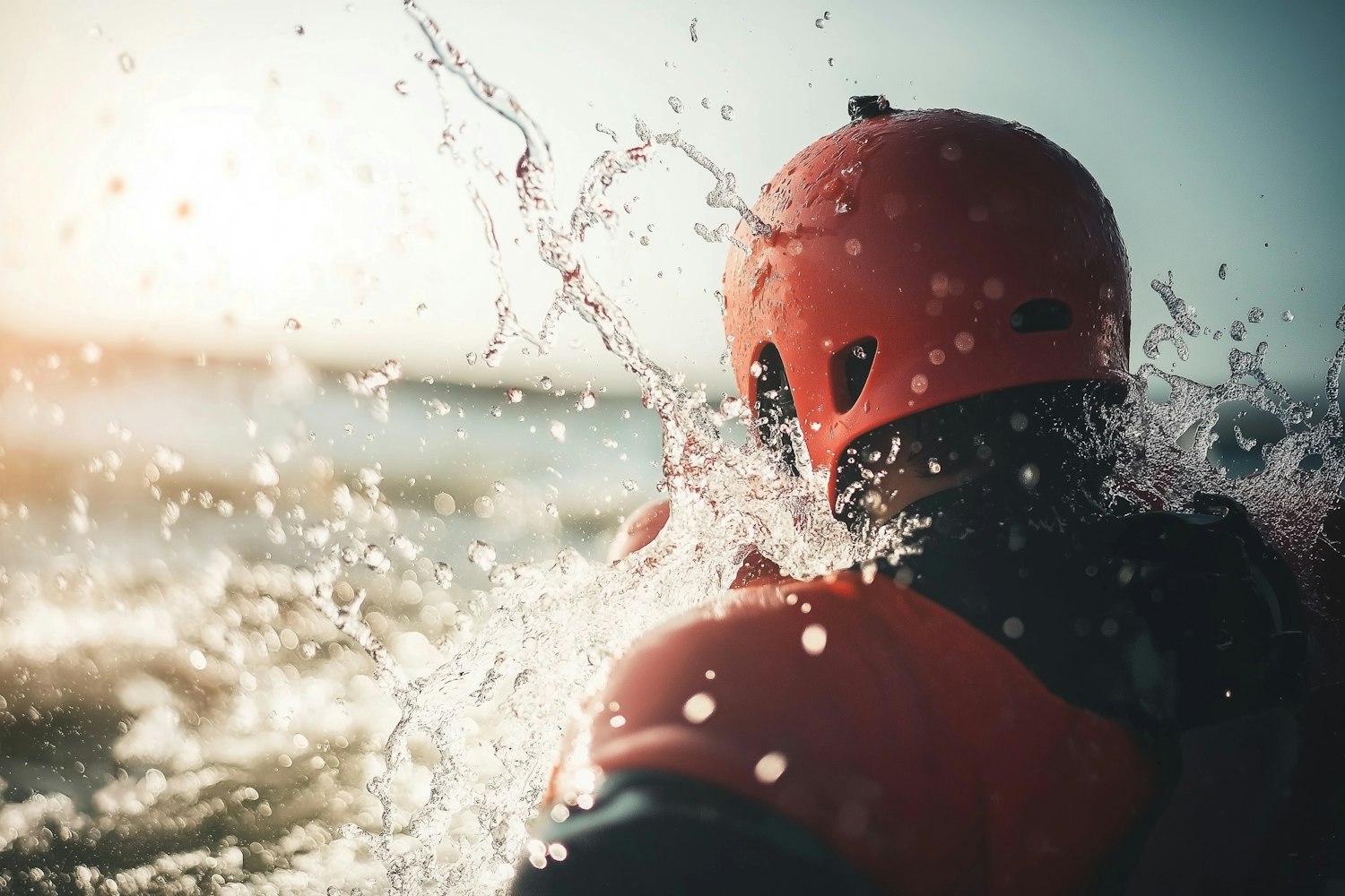 Person in orange helmet and life jacket splashes through water, capturing the thrill of water sports in a sunlit scene.
