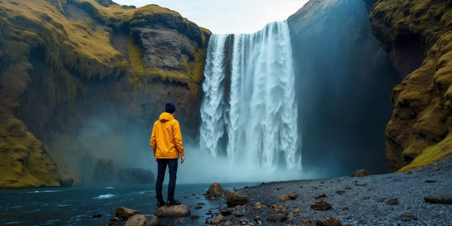 A person in a yellow jacket stands near a majestic waterfall surrounded by mossy cliffs and mist, creating a serene and powerful scene.