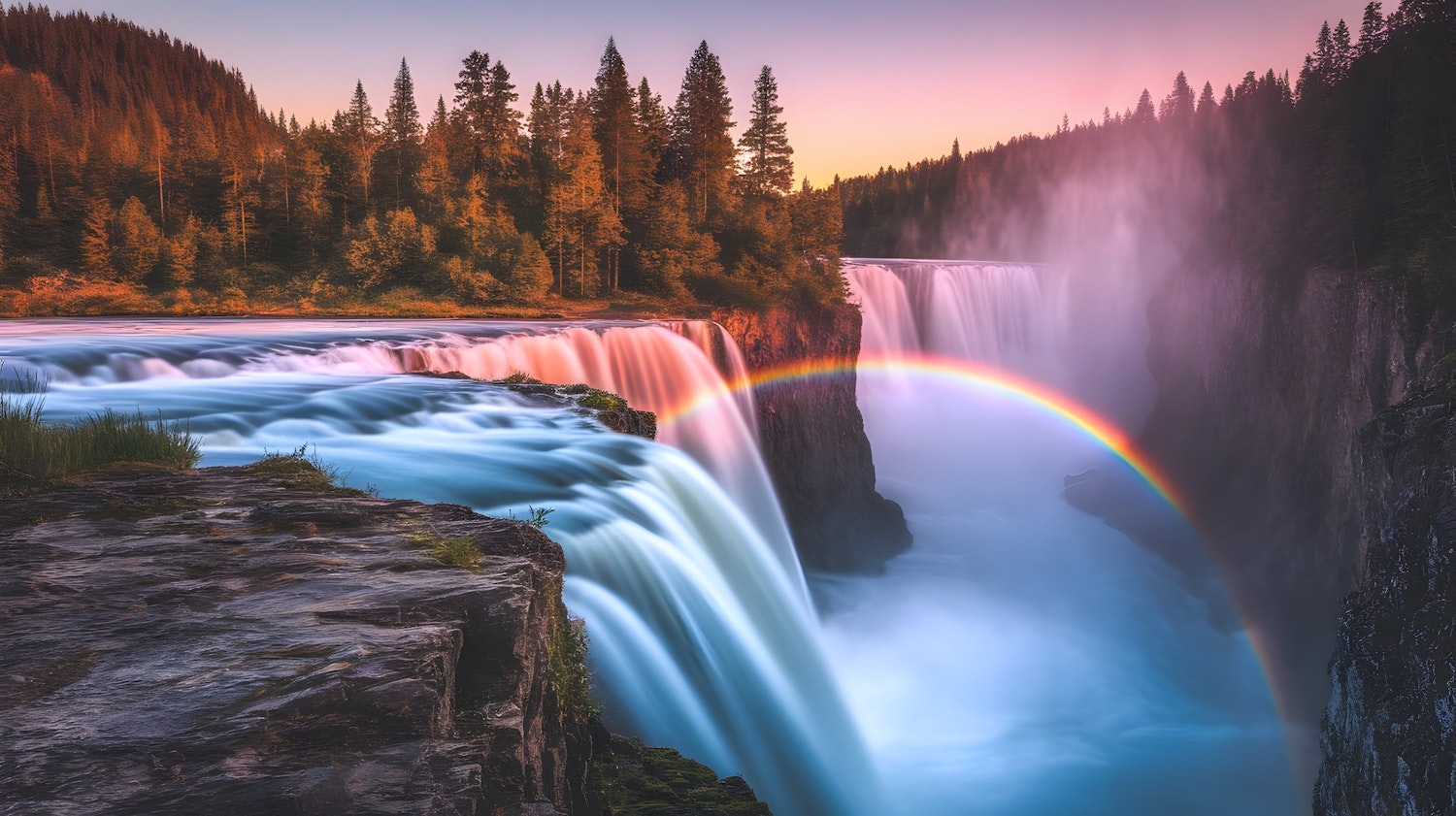 Stunning waterfall with a vibrant rainbow in mist, surrounded by glowing trees at sunset. A serene and magical natural landscape.