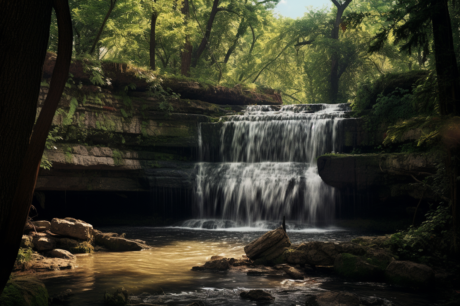 Tranquil waterfall surrounded by lush greenery and sunlight, creating a serene and peaceful natural scene.
