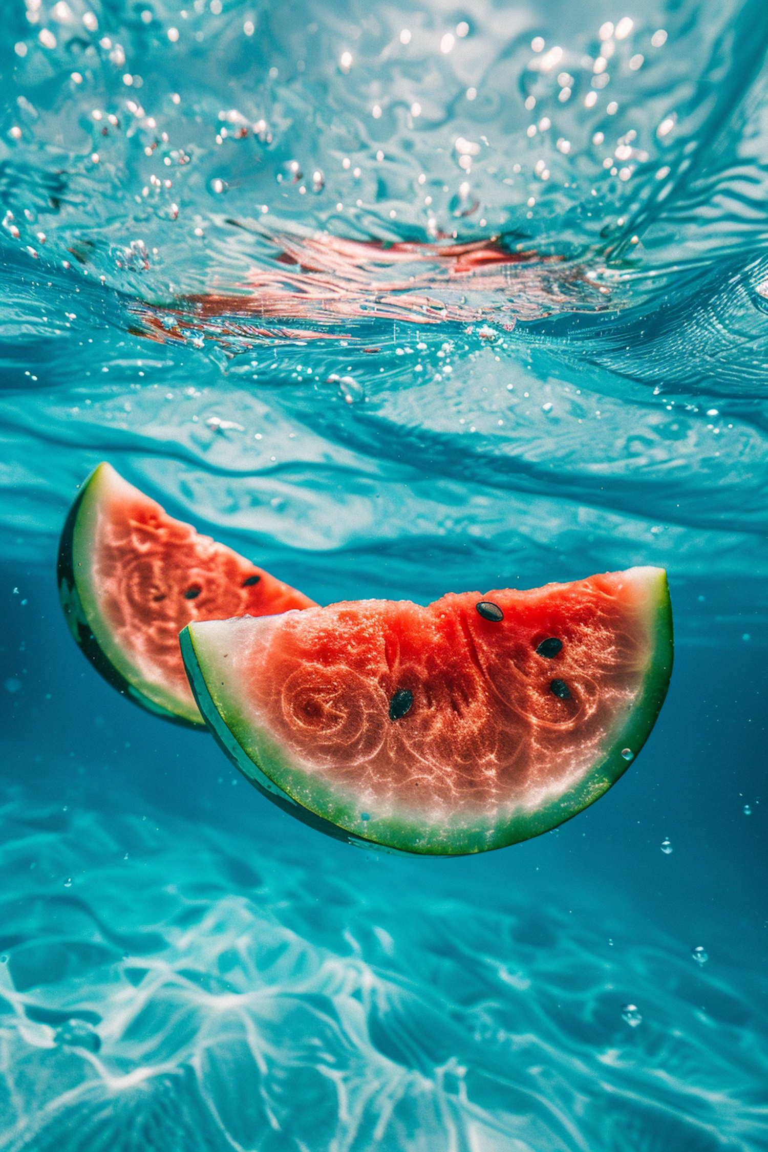 Vibrant watermelon slices float underwater, surrounded by bubbles and sunlight, creating a refreshing summer vibe.